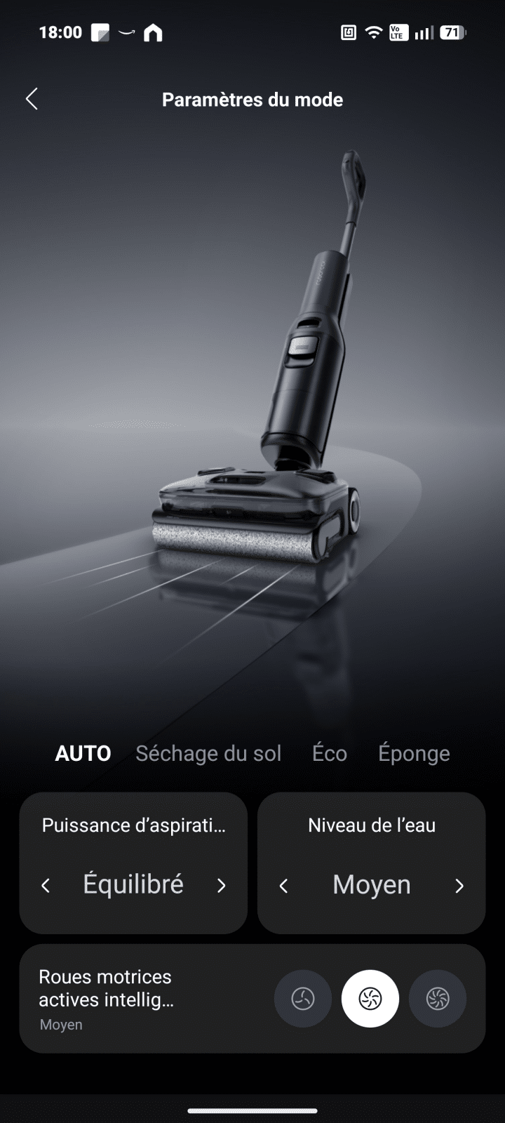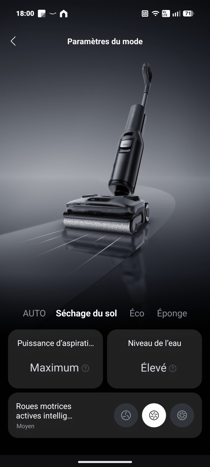 L’IA de détection fonctionne bien. Lorsque je passe sur une zone sale, l’appareil accélère. Le bruit change. La puissance monte. Ensuite, elle redescend. Cela évite de gaspiller la batterie. Après 25 minutes, il restait encore de l’autonomie.