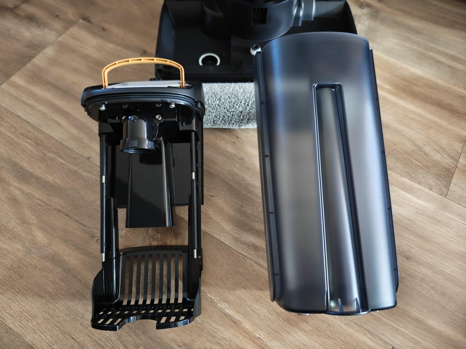 Dans la boîte, on trouve l’essentiel. Il y a le nettoyeur, la base, le rouleau et une solution nettoyante. Il n’y a pas d’outil de nettoyage de fourni permettant par exemple de retirer les cheveux. Cependant, je n’en ai pas eu besoin. Le système anti enchevêtrement fonctionne bien.
