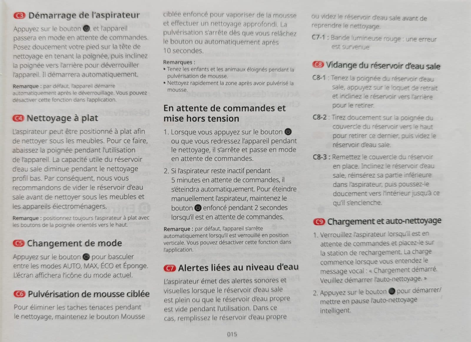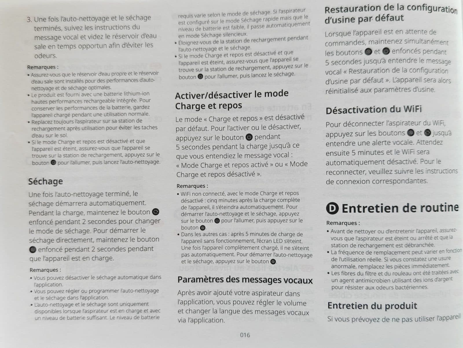 Le réservoir d’eau propre est suffisant pour un niveau complet. Ensuite, il faut le remplir. L’opération est simple. Le réservoir d’eau sale se retire facilement. En revanche, il faut le vider après chaque usage. Sinon, l’odeur apparaît. Petit conseil au passage, ne pas hésiter à mettre une goutte d’huile essentiel dans le réservoir d’eau sale une fois vidé. Cela permet d’éviter les mauvais odeurs stagnantes.