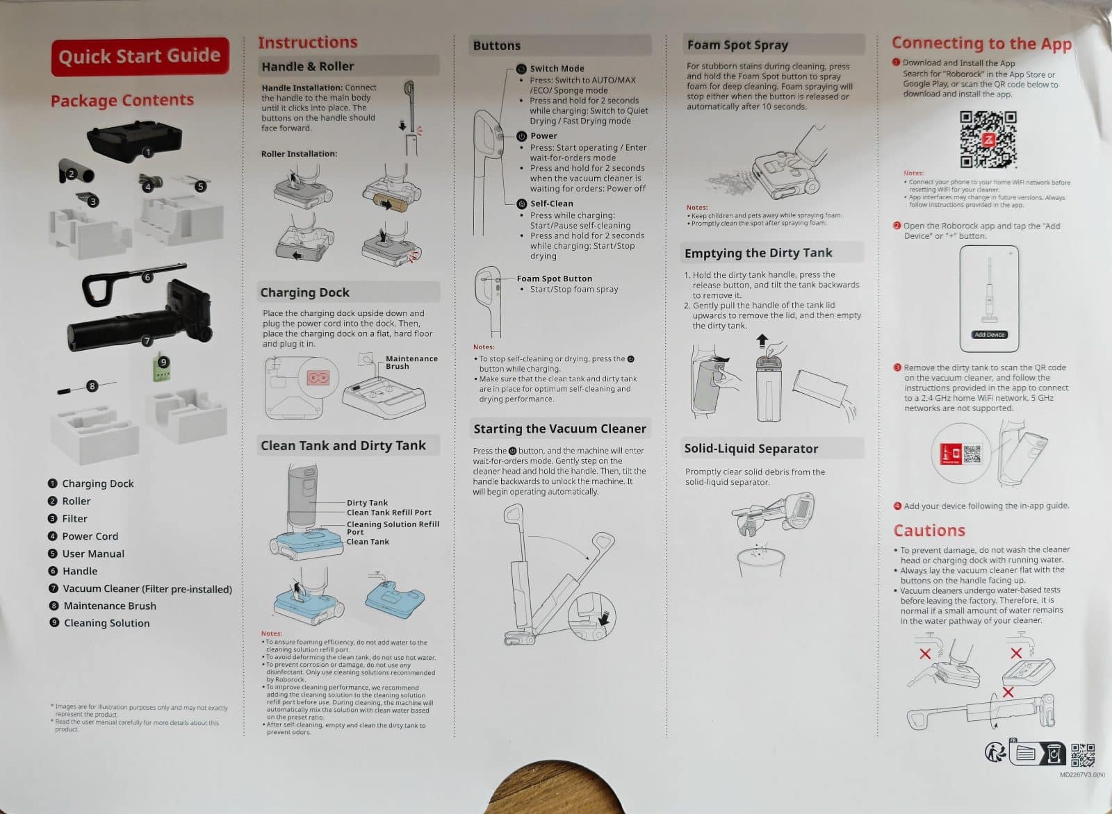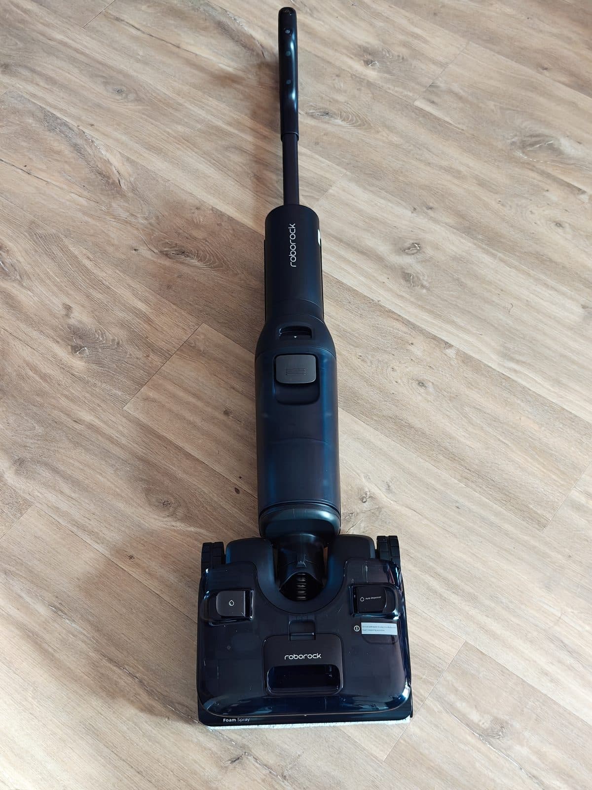 Comparé au Tineco Floor One S9 Artist que j’avais testé l’an dernier, le Roborock est plus compact. Il paraît tout aussi robuste. Le design est moins « objet de salon ». Il reste plus dans la fonctionnalité. La tête de nettoyage est fine. Ainsi, elle passe facilement sous les meubles. Enfin, l’assemblage est simple. Il suffit de clipser la poignée. En moins d’une minute, l’appareil est prêt.