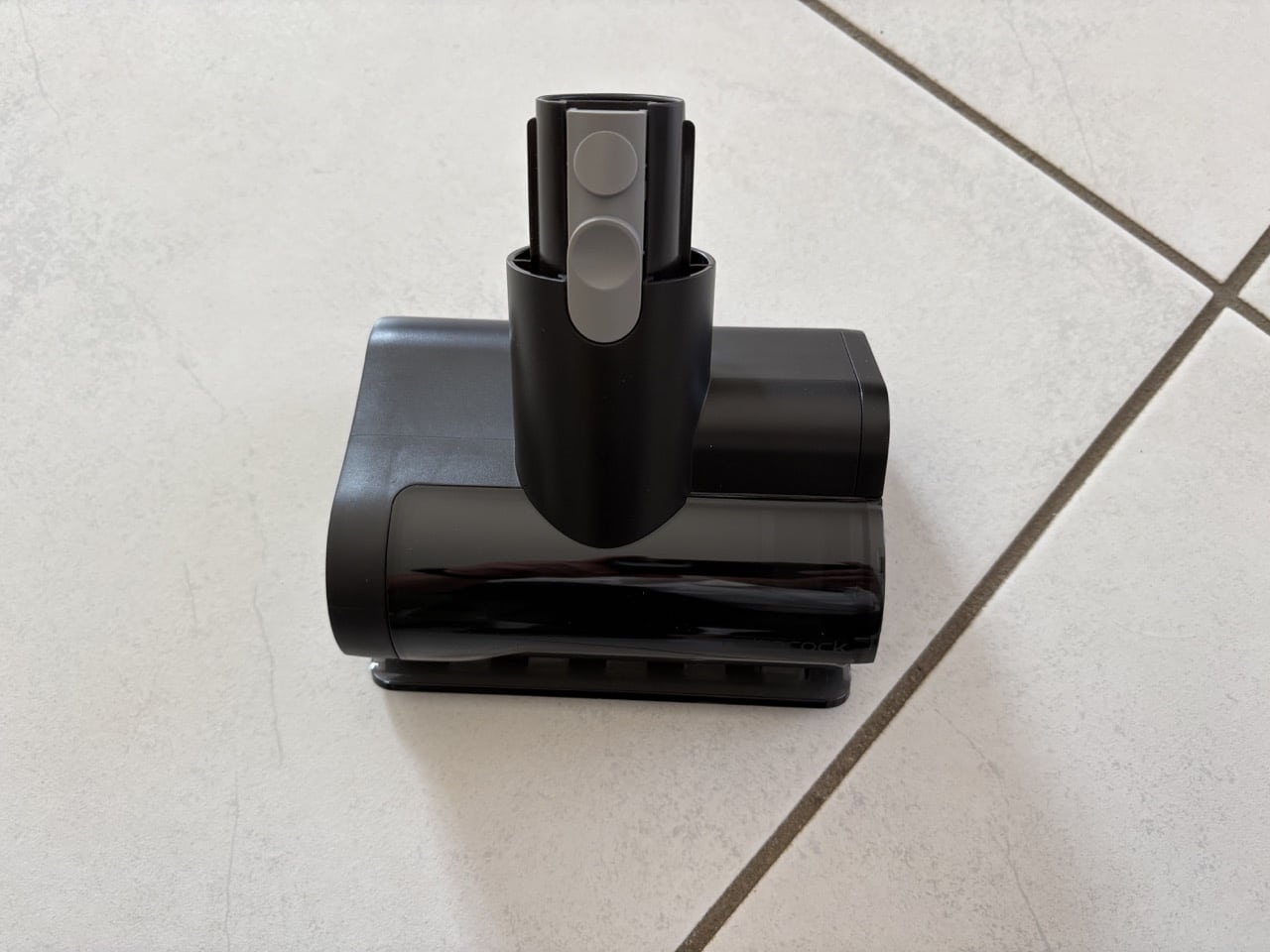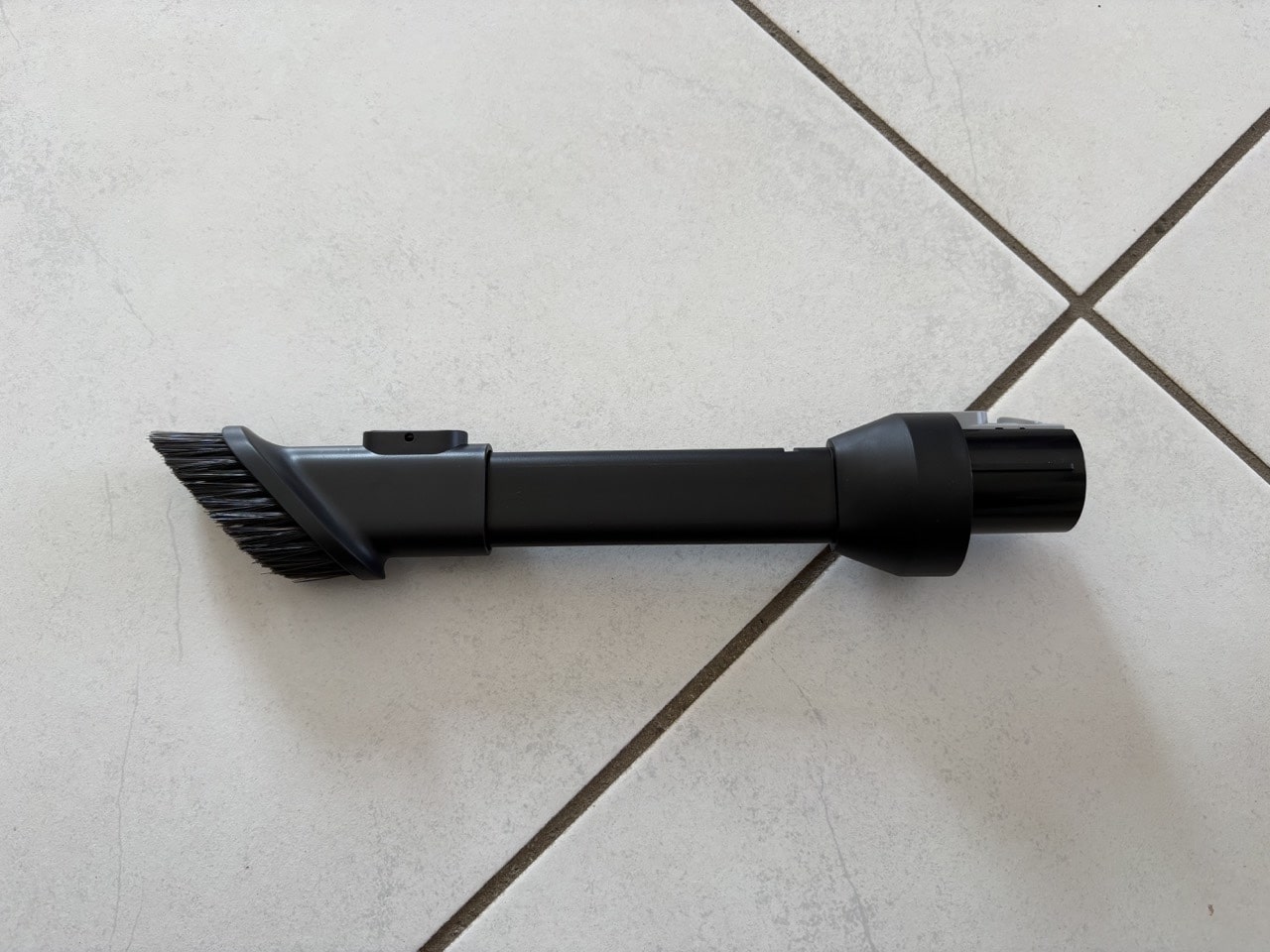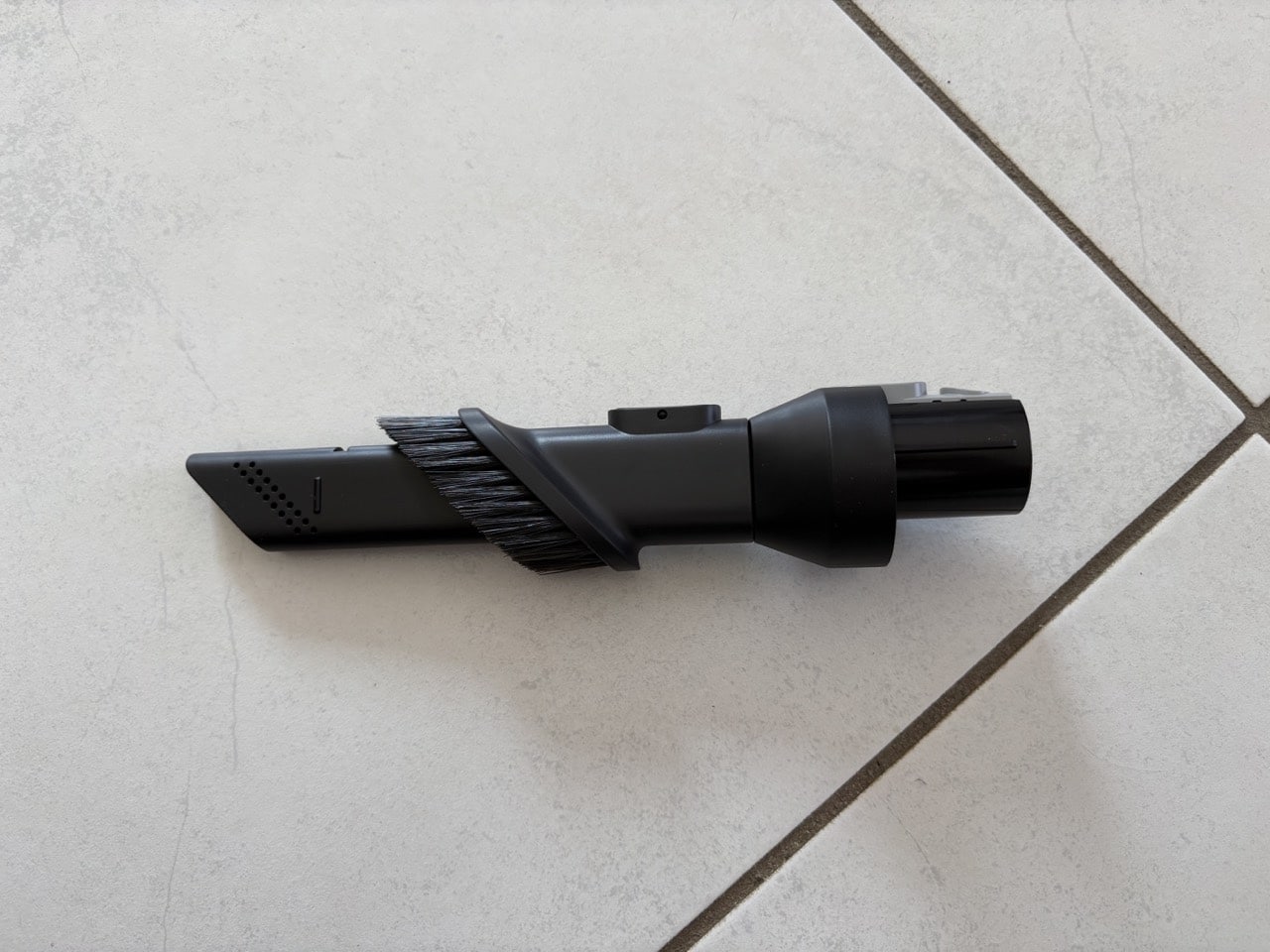 On apprécie également les accessoires fournis : une mini-brosse motorisée pour les tissus ou les poils d’animaux, un suceur plat pour les recoins et une brosse deux-en-un pour les surfaces délicates. Le tout se range aisément.