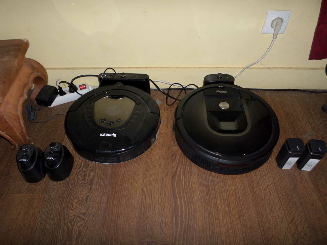 J’ai pu le mettre à rude épreuve car mes différentes pièces ne sont pas forcément au même niveau et il a du cohabiter avec 5 Bouledogues Français qui laissent des poils partout. De plus le Roomba avait de la concurrence avec mon aspirateur robot de milieu de gamme de chez H.Koenig, que nous appelons à la maison, Wall-E. Premier bon point, le Roomba a un joli design et il est bardé de plusieurs capteurs pour l’empêcher de tomber dans les escaliers et de se cogner sur les meubles mais pas de lampe UV pour détruire les bactéries.