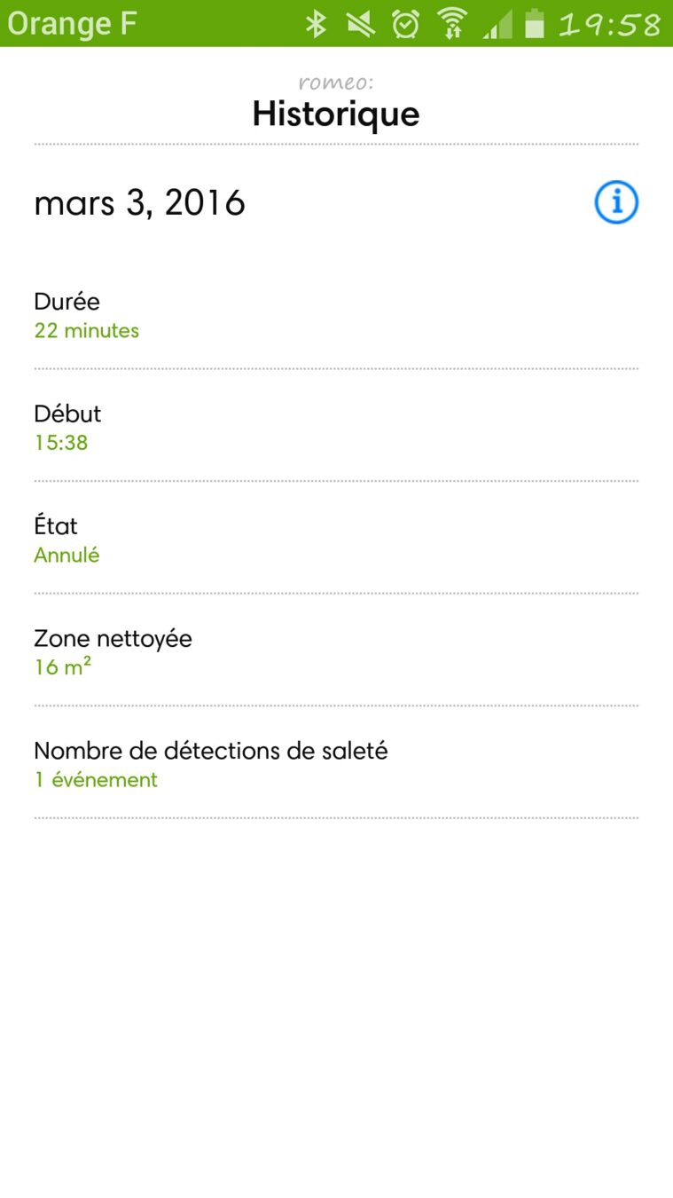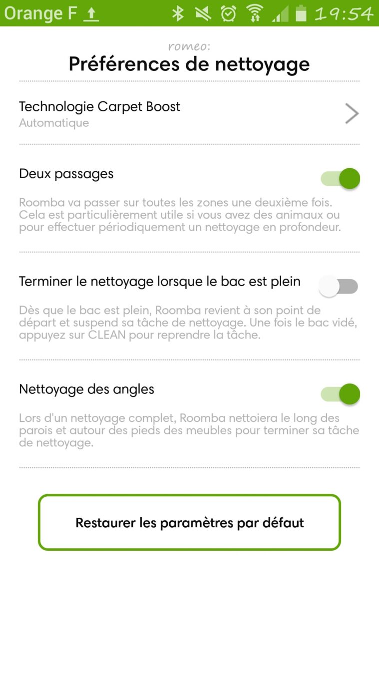 Dans un premier temps il faut trouver un emplacement où garer la bête avec une prise à proximité. Ensuite, une fois l’application iRobot téléchargée (iOS et Android), je n’avais plus qu’a suivre le tutoriel pour l’appairer au réseau wifi de la maison et accéder au divers paramètres de l’aspirateur. Pas de panique, l’appli est épurée, bien expliquée et sans complexité. Elle m’a permis bien sûr de lancer le cycle de nettoyage, depuis chez moi ou en extérieur, de régler les préférences, de programmer le Roomba 980 suivant les jours de la semaine et à partir d’une heure choisie. Je pouvais aussi consulter les besoins d’entretiens, commander les accessoires qui finissent pas s’user avec le temps et suivre l’historique de ces balades dans la maison.