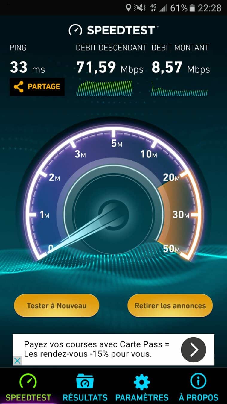 Puisque nous sommes dans les chiffres pour le moment, pourquoi passer à côté de ceux de la connectivité ? Il ne faut pas oublier que ce Galaxy S7 est compatible 4 G bien entendu et les débits sont plutôt pas mal puisque j’ai réussi à atteindre 71 Mb/s chez Bouygues. Du côté du Bluetooth on retrouve la dernière version, soit la 4.2. Le GPS n’est pas en reste non plus puisque le fix est obtenu en quelques secondes avec une précision remarquable. Le NFC est également de la partie et je n’aurai jamais cru dire ça, mais j’aurais aimé que Samsung Pay soit disponible en France afin de pouvoir le tester sur un smartphone de la marque. Autre fonctionnalité très intéressante également, le « Download Booster » qui permet de télécharger des fichiers de grosses tailles en utilisant le Wi-Fi ET la 4 G simultanément.