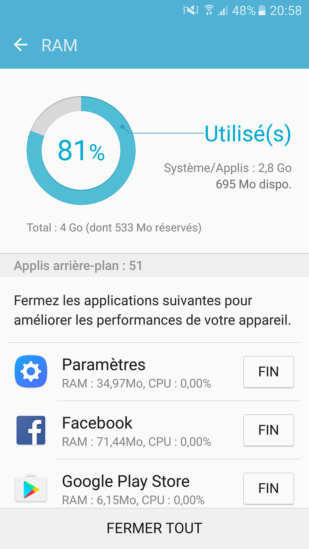 J’en profite pour parler de l’interface de ce Galaxy S7. Ma dernière expérience Samsung/TouchWizz remonte à la sortie du premier Galaxy Note, autant dire que ça remonte à quelques années. Et ces années ont permis à Samsung de revisiter sa surcouche dans le bon sens. En effet de grands changements sont présents pour cette nouvelle mouture conçue tout spécialement pour Android Marshmallow 6.0, en comparaison aux anciennes versions. Des icônes bien plus agréables, une gestion des notifications non lues (une petite pastille avec le nombre de notifications sur les applications qui le supporte) et surtout une surcouche beaucoup moins énergivore en mémoire vive. En parlant de la mémoire RAM, il faut savoir que la bête embarque pas moins de 4 GB en LPDDR4 (seulement 3.5 sont disponibles pour l’utilisateur) ce qui permettra d’avoir une multitude d’applications ouvertes en fond sans jamais ressentir le moindre ralentissement. Et ça se confirme bien dans la réalité, puisque tout le temps du test je n’ai jamais ressenti la moindre saccade dans la navigation, et ce malgré le nombre incroyable d’applications ouvertes. Le stockage, quant à lui, est de 32GB extensible par carte mémoire. Il est même possible de mettre en place un « Adoptable Storage » afin de réunir les deux mémoires en une seule et ainsi éviter les problèmes d’application ne voulant pas s’installer sur la mémoire externe.