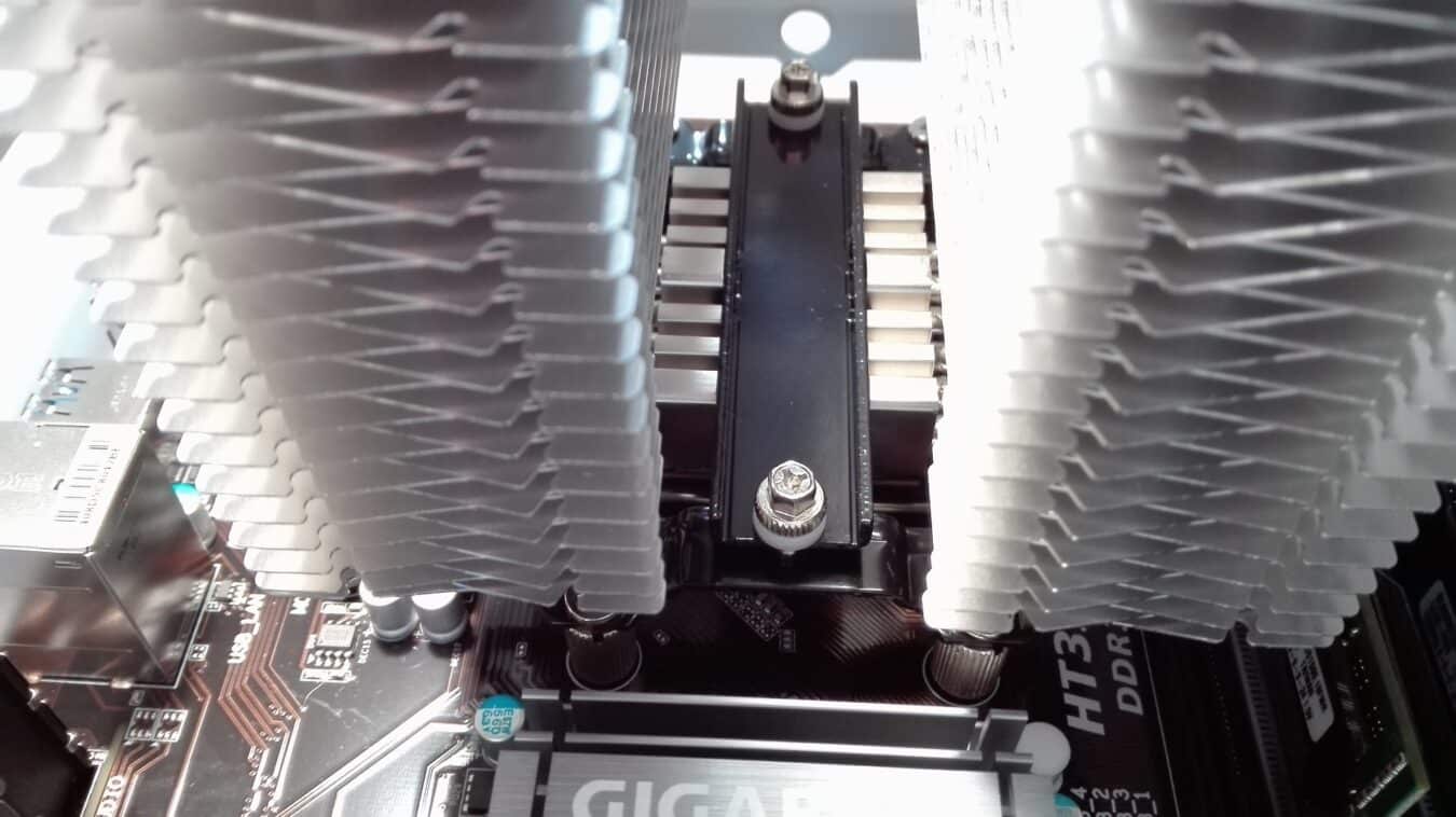 Comme vous pouvez le voir sur le diaporama ci dessus, qui représente les grandes lignes de l’installation, la plaque d’origine va être utilisée pour les personnes ayant un processeur AMD (Pour Intel une backplate est fournie). Il suffira ensuite d’installer les 4 vis qui accueilleront les plaques de montages (deuxième photo). Viens ensuite l’installation des dites plaques de montage sur lesquelles le radiateur du ventirad viendra se poser et finir par y apposer la barre de montage entre les deux tours (troisième photo). C’est cette dernière manipulation qui pourra poser un problème pour visser correctement les vis. Pour ceux qui se le demanderaient, sachez que les barrettes de RAM en low-profil (sans dissipateur) sont plus que conseillé étant donné que le Fuma a tendance à dépasser un peu.