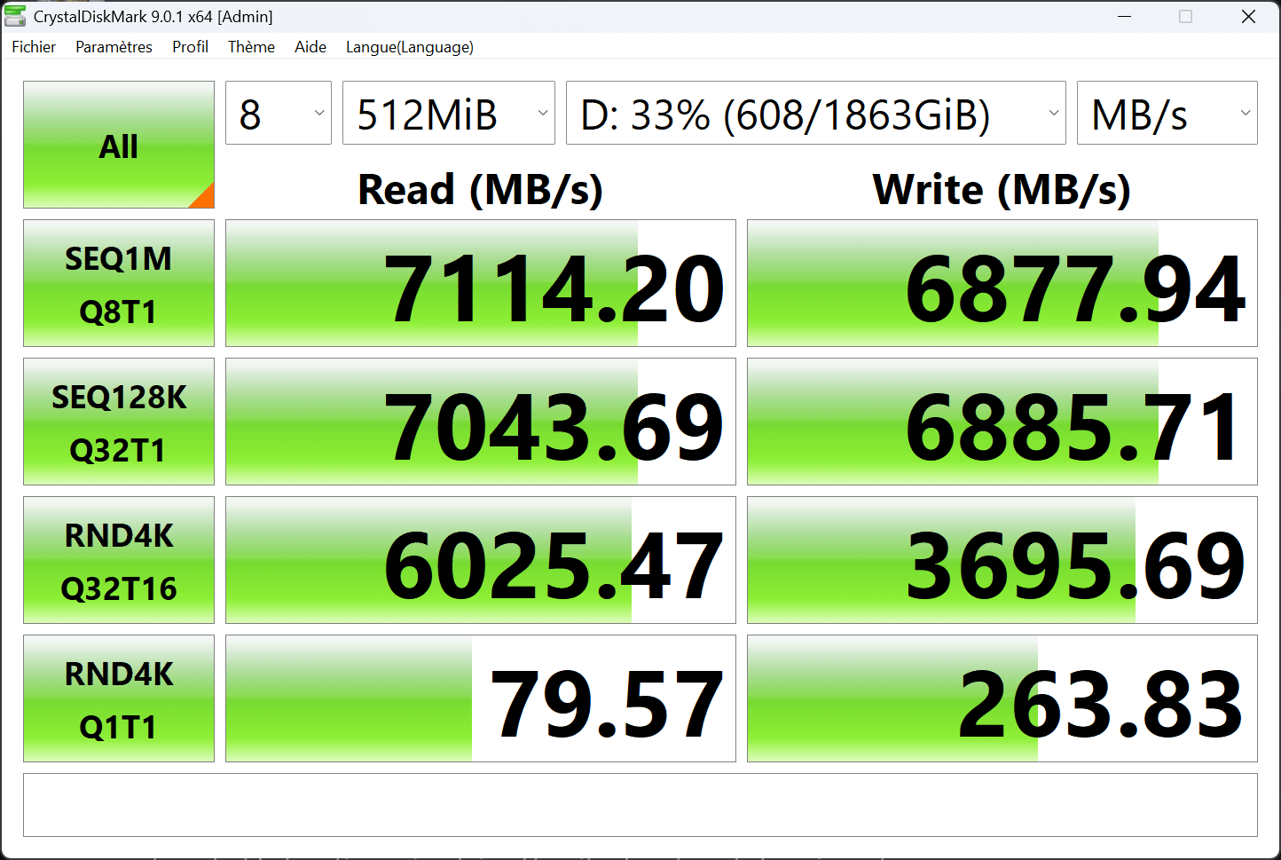 Les performances annoncées par Seagate sont très ambitieuses, avec des débits pouvant atteindre 10 000 Mo/s en lecture et en écriture. Dans les faits, les benchmarks réalisés avec CrystalDiskMark montrent des résultats légèrement inférieurs. On observe plutôt des vitesses situées entre 7 et 8 Go/s en lecture séquentielle, selon la configuration et la plateforme utilisée. Les écritures suivent la même logique. Les chiffres restent néanmoins impressionnants et largement au-dessus de ce que proposent la majorité des SSD PCIe Gen4 haut de gamme.