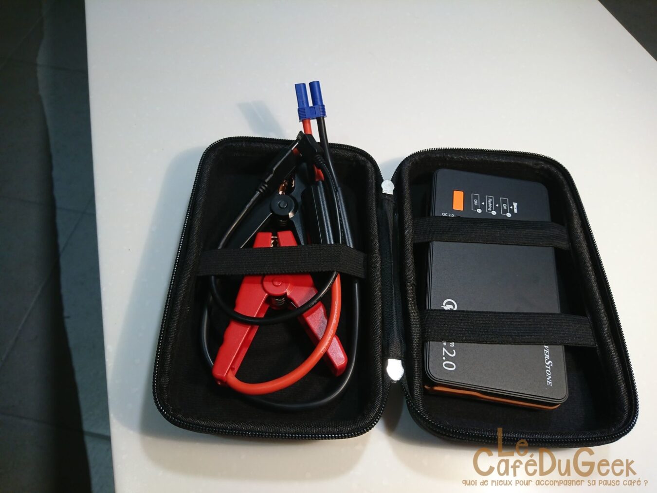 La batterie est livrée dans une housse de transport, plutôt pratique sachant qu’elle est plutôt lourde (300g) et assez imposante avec des dimensions de 152.3 mm x 80 mm x 22 mm. Dans la housse nous retrouvons donc la batterie et son câble micro USB. Le plus inattendu est bien sur les pinces croco, elles aussi présente dans la boite. Ce sont avec ces dernières que vous pourrez démarrer votre voiture, ou votre moto, en les branchant directement sur la batterie du véhicule (en prenant bien soin de brancher les cosses sur leur pôles respectif. À savoir que le rouge va sur le + de la batterie, et le noir sur le -).