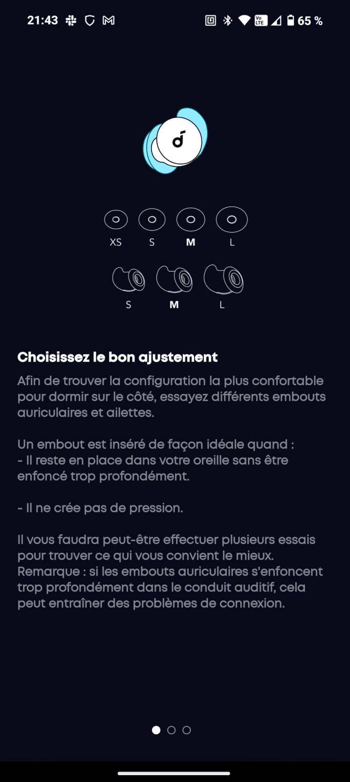 Sur le plan confort, je l’ai porté plusieurs nuits consécutives. En position dorsale, aucun souci : les écouteurs sont quasi invisibles. En position latérale, il y a parfois une pression selon l’oreiller ou si j’ai choisi un embout trop « scellant ». C’est très dépendant du choix des embouts/wings, et de la morphologie de l’oreille.