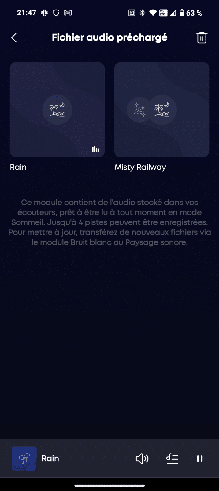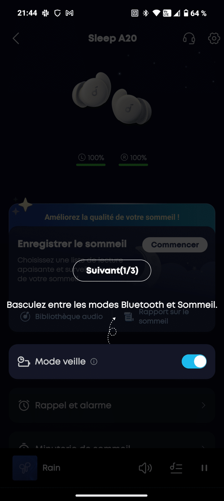Si je souhaite écouter ma propre playlist (podcast, musique) pour m’endormir, je laisse l’écouteur en mode Bluetooth et je lance via mon appli de lecture. Une fois endormi, je pourrais laisser le fond sonore jouer, mais la consommation de batterie est plus rapide. Le mode Sleep est plus efficace énergétiquement pour diffusion de bruit blanc ou sons intégrés.