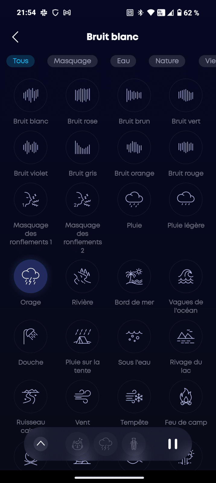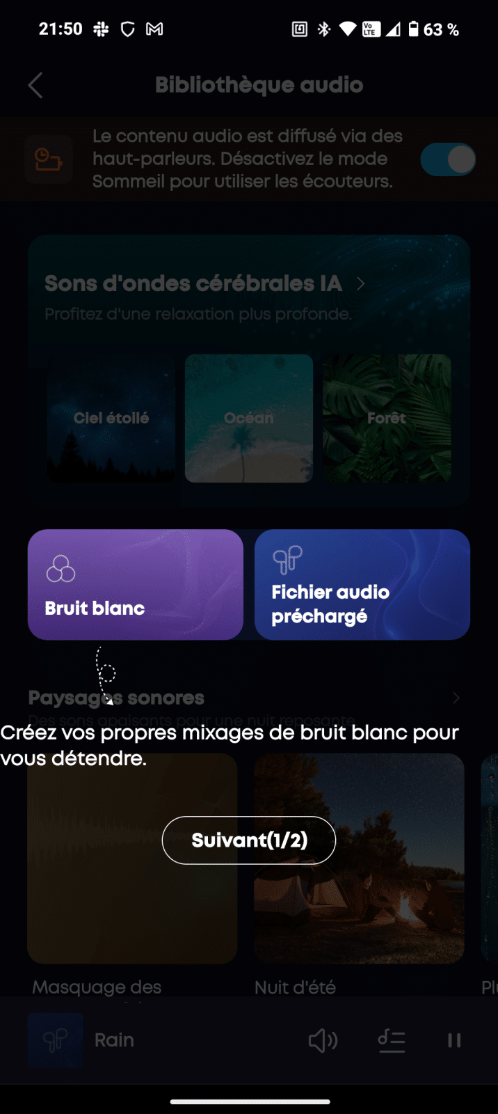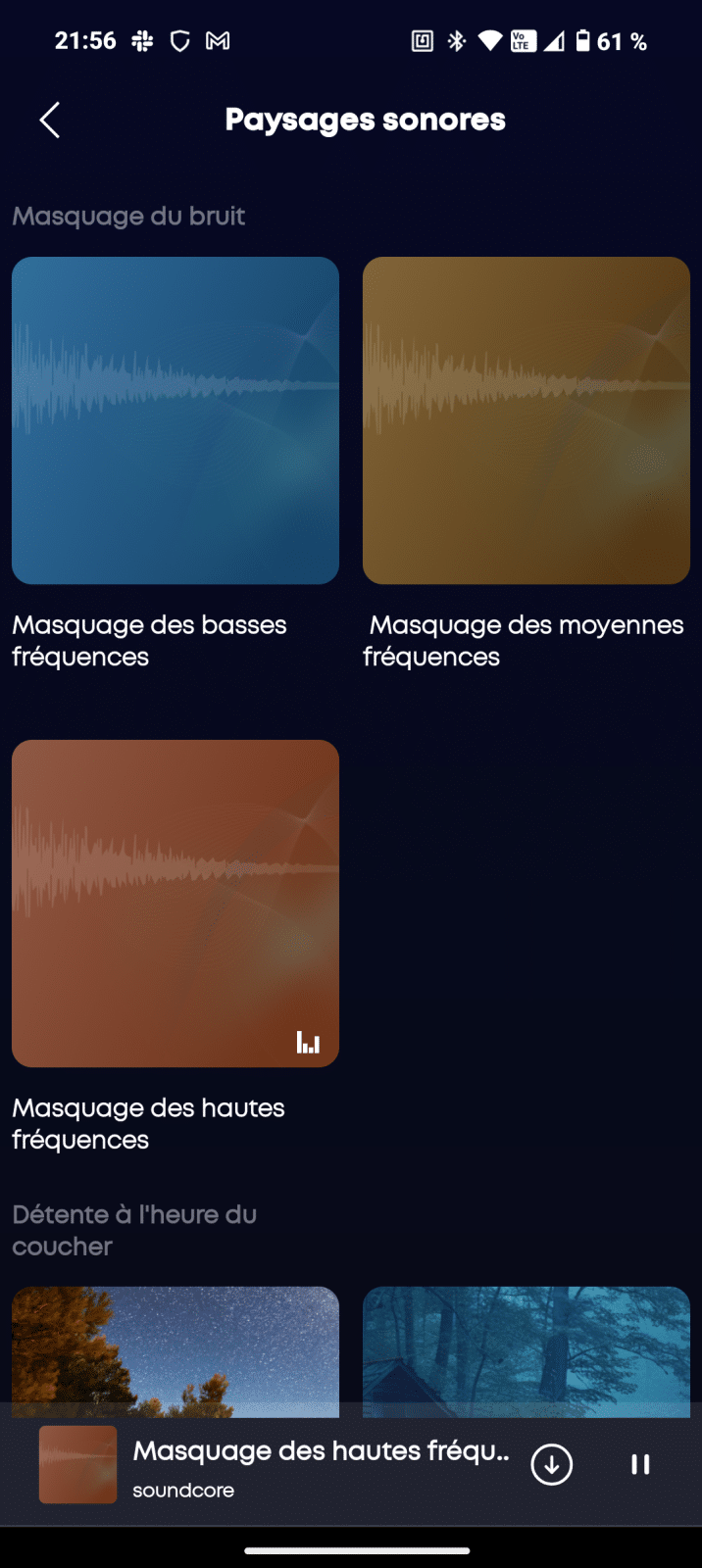 À l’avant-plan du Sleep A20 : l’isolation passive. Le concept repose sur des embouts twin seal et un bon scellement pour bloquer le bruit ambiant. Selon Soundcore, cette approche permet 3× plus de réduction passive que des embouts classiques. Pour compenser l’absence d’ANC, l’application embarque un système de masquage sonore à “4 points”, avec une bibliothèque de bruits blancs, sons naturels et ambiances relaxantes. On peut mixer jusqu’à 3 pistes différentes, ajuster leur volume, puis les transférer vers les écouteurs pour un usage autonome en mode Sleep.