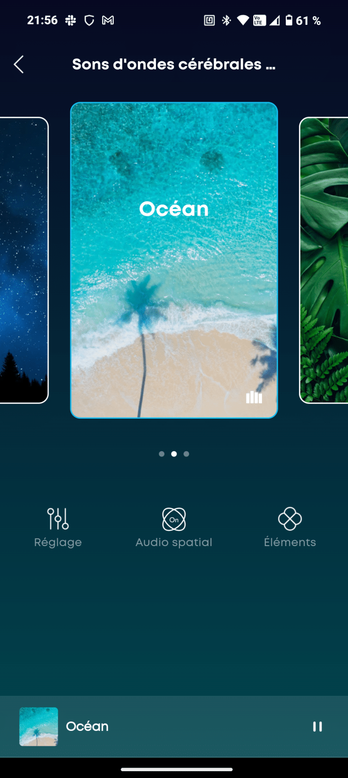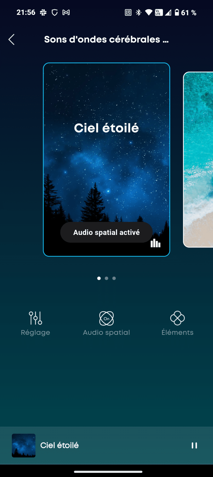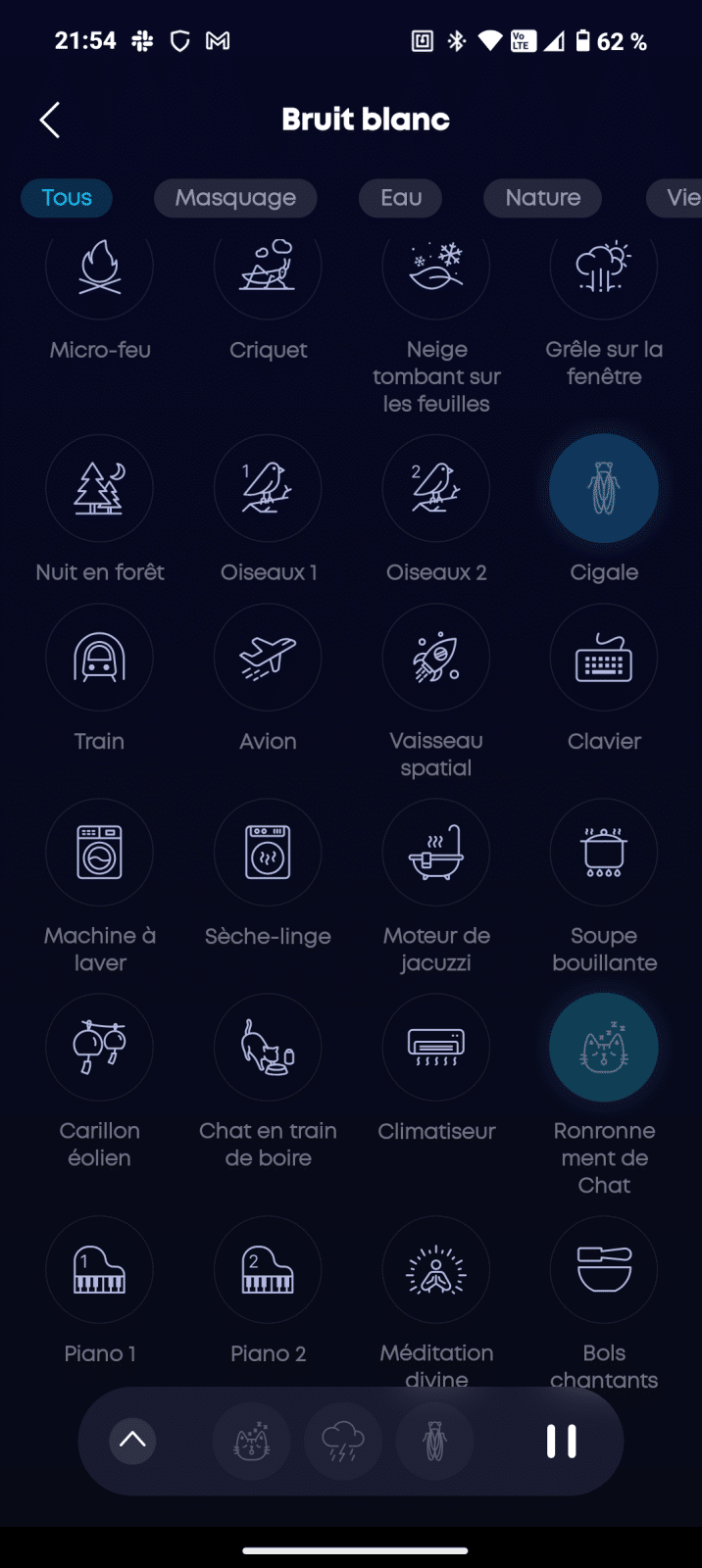 À l’avant-plan du Sleep A20 : l’isolation passive. Le concept repose sur des embouts twin seal et un bon scellement pour bloquer le bruit ambiant. Selon Soundcore, cette approche permet 3× plus de réduction passive que des embouts classiques. Pour compenser l’absence d’ANC, l’application embarque un système de masquage sonore à “4 points”, avec une bibliothèque de bruits blancs, sons naturels et ambiances relaxantes. On peut mixer jusqu’à 3 pistes différentes, ajuster leur volume, puis les transférer vers les écouteurs pour un usage autonome en mode Sleep.