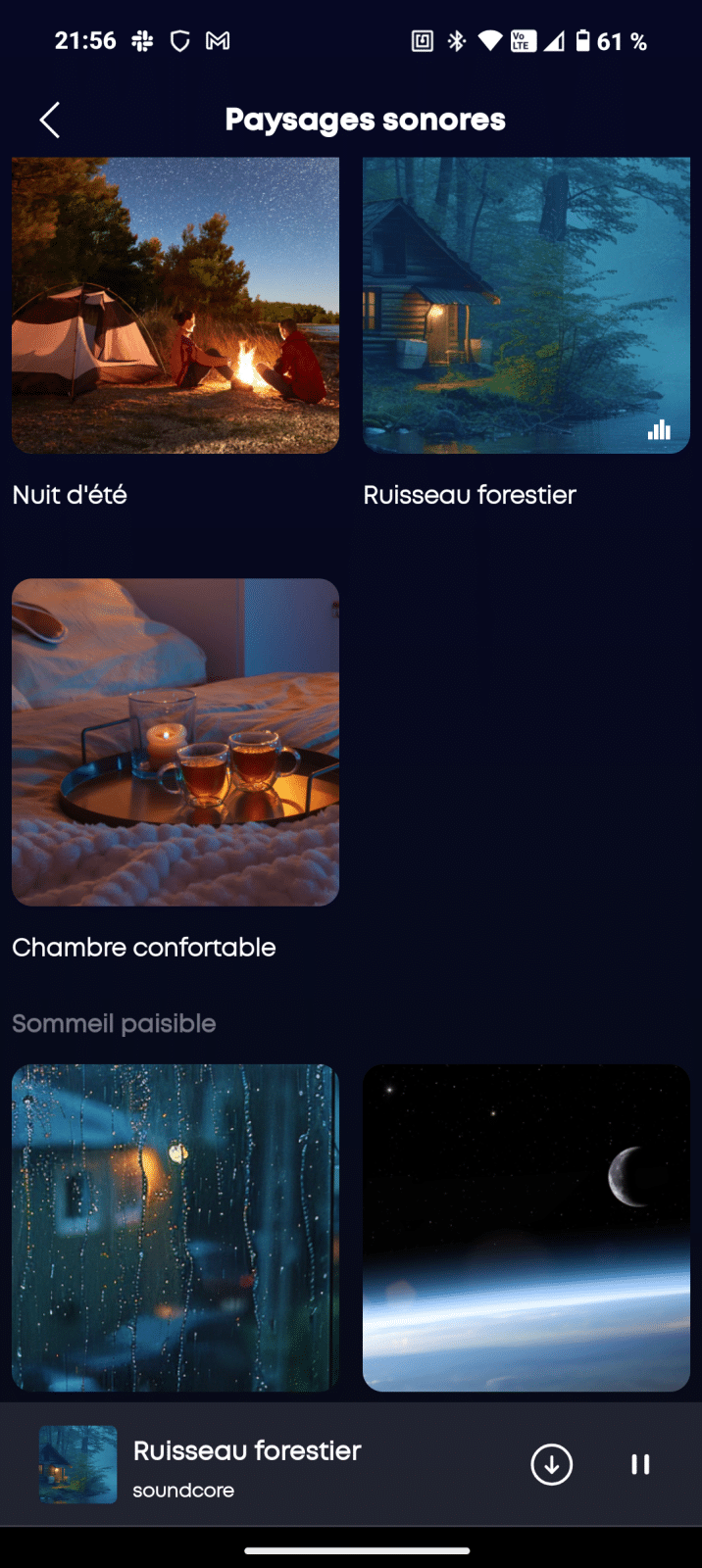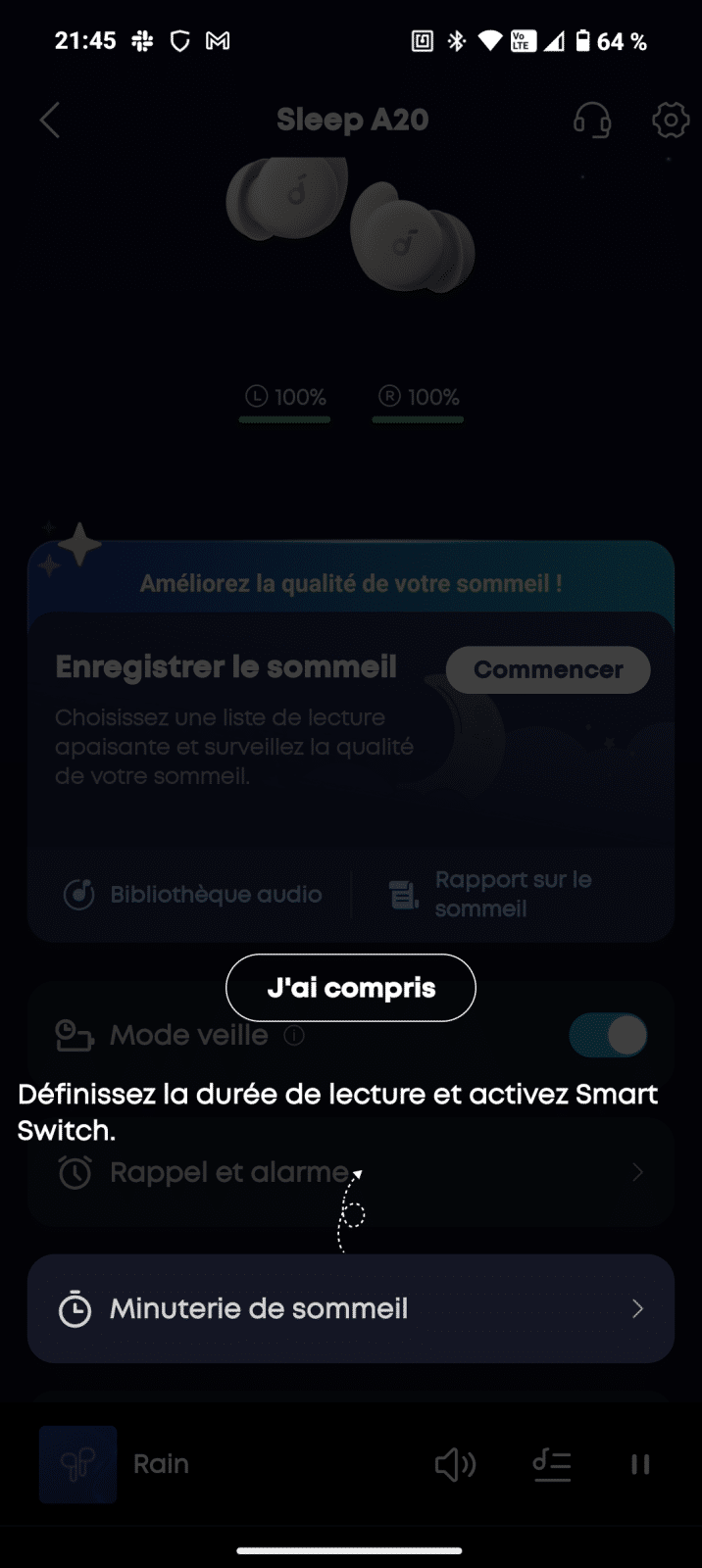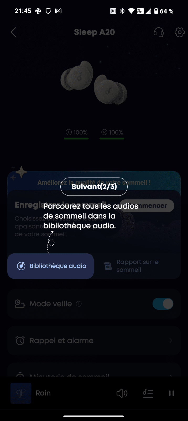 Pour s’endormir avec l’appli, je me connecte en Bluetooth, je sélectionne jusqu’à 3 sons (pluie, vent, forêt) dans l’application Soundcore, je règle les volumes individuels, puis je les transfère vers les écouteurs. Quand je passe en mode Sleep, les sons continuent sans que le smartphone ne soit actif. Si je m’endors, le système arrête la lecture automatiquement (Smart Volume / Smart Switch). Cette transition fonctionne souvent bien, mais dans certains cas, si l’app perd la connexion, elle ne bascule pas comme prévu.