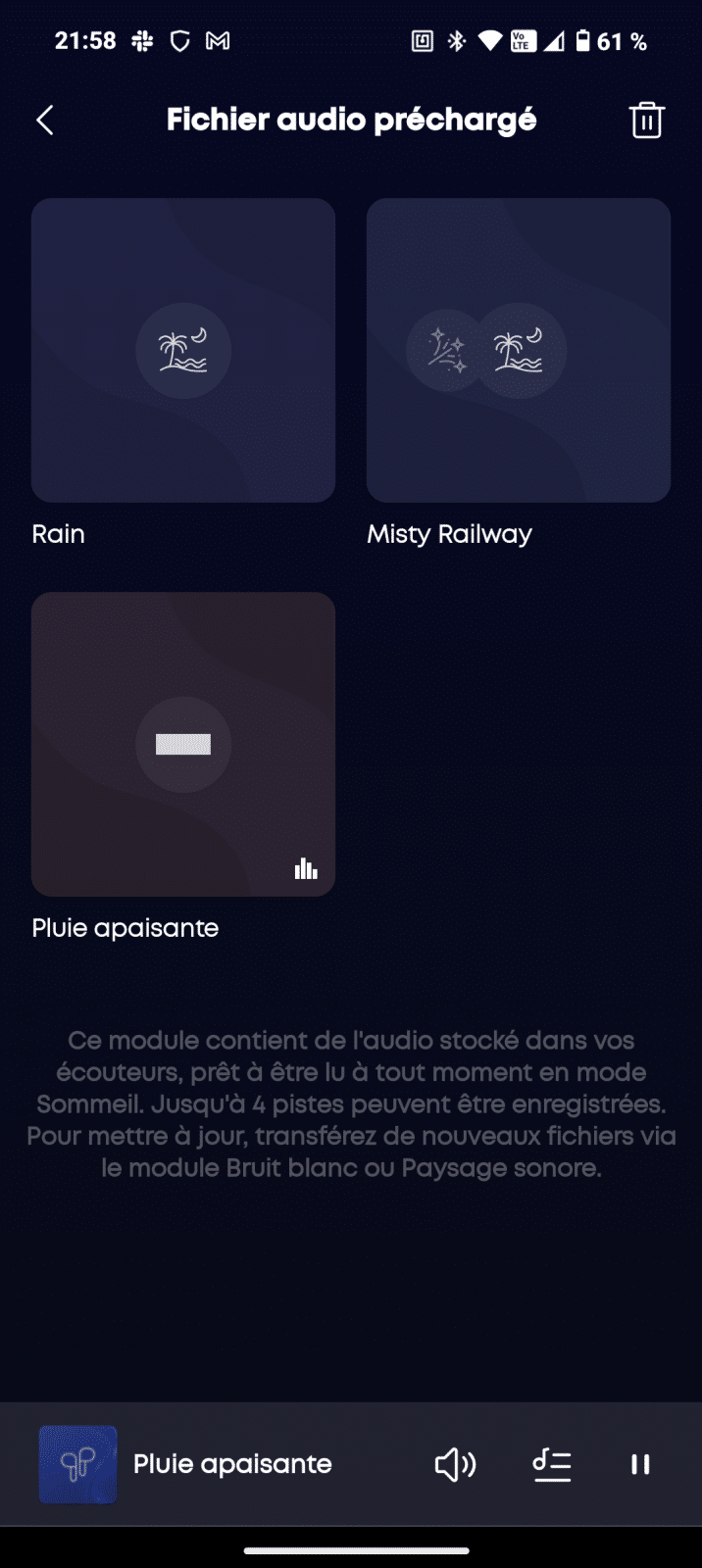 Ceci dit, l’absence d’ANC limite l’efficacité face à des bruits graves ou constants (voiture, ascenseur, voisins). La qualité audio, loin d’être premium, suffit pour dormir mais pas pour apprécier pleinement musique ou podcasts exigeants. L’application demande une phase de prise en main, elle peut dérouter. Enfin, le suivi du sommeil reste perfectible : utile pour une tendance, mais peu fiable comme outil médical.