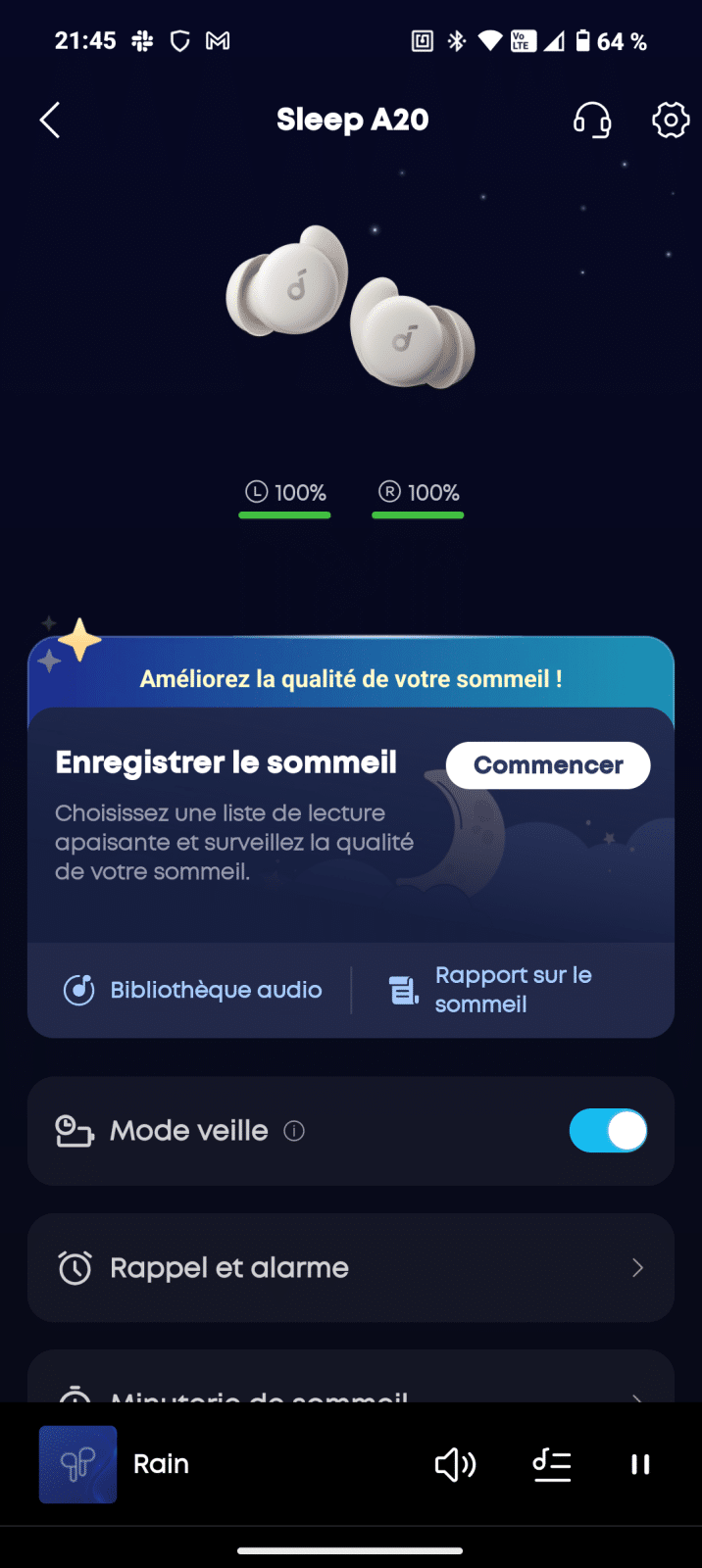 D’autres options : l’égaliseur (8 bandes) pour ajuster l’ambiance sonore, la fonction “find my earbud” (faire sonner l’écouteur si perdu) et les mises à jour firmware via l’appli. En résumé, malgré l’absence de fonctions avancées comme ANC, le Sleep A20 offre une palette riche pour personnaliser l’expérience nocturne.