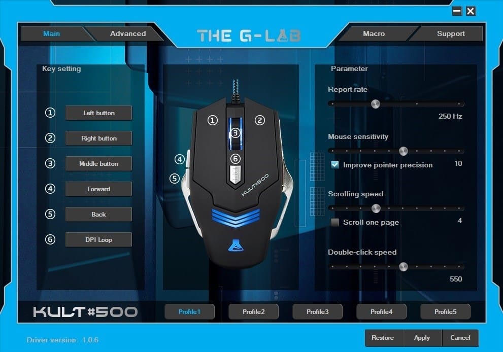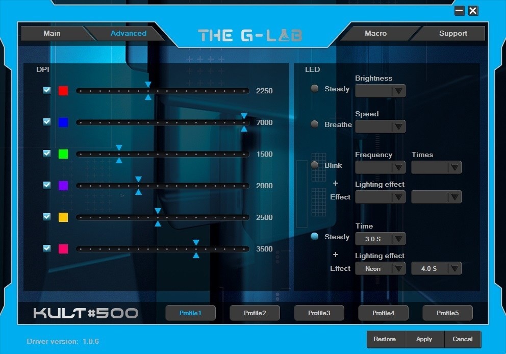 Avec une vitesse pouvant monter jusqu’à 7000 DPI, le logiciel KULT Gaming Mouse vous permettra d’ajuster tous les paramètres afin de configurer votre souris comme vous le souhaitez. Sur chacun des profils, vous pourrez configurer vos DPI, le taux de rafraichissement (donc le temps entre le moment où vous bougez la souris et où l’information est captée par l’ordinateur), etc.