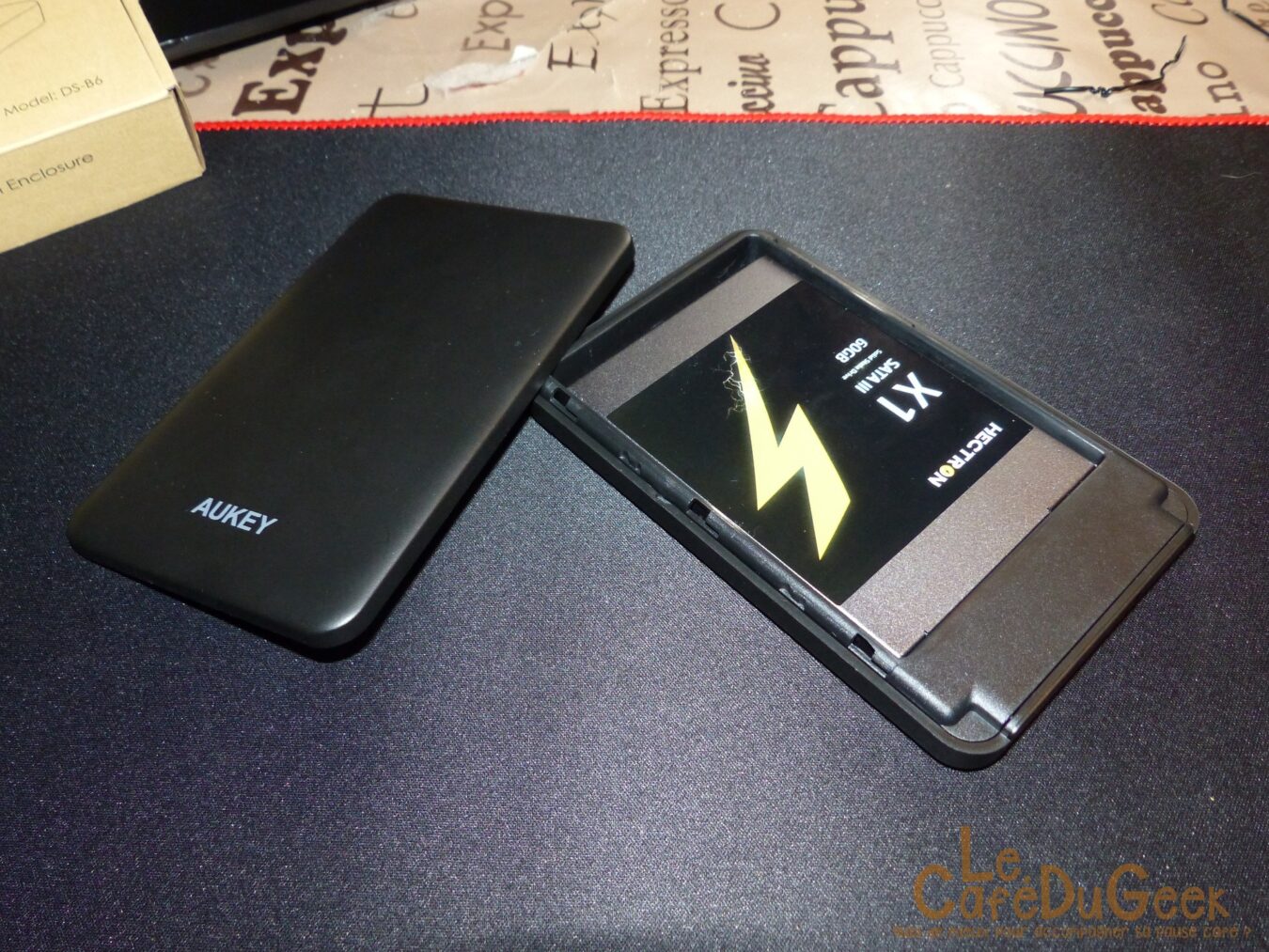 Donc dans la boite, j’ai trouvé le boitier Aukey et un câble Type C. Sur le dessus, le capot s’ouvre facilement pour donner l’accès au port SATA. D’une dimension de 13.97 x 8.38 x 1.27 cm, Le boîtier de disque dur peut accueillir des disques durs 2.5 « . Ou des SSD jusqu’à 9.5 mm d’épaisseur. Aussi lorsque le boitier est branché sur un port Type C ou un port USB 3.0 (avec un autre câble), le taux de transfert peut atteindre 5 Gbps suivant le matériel installé à l’intérieur.