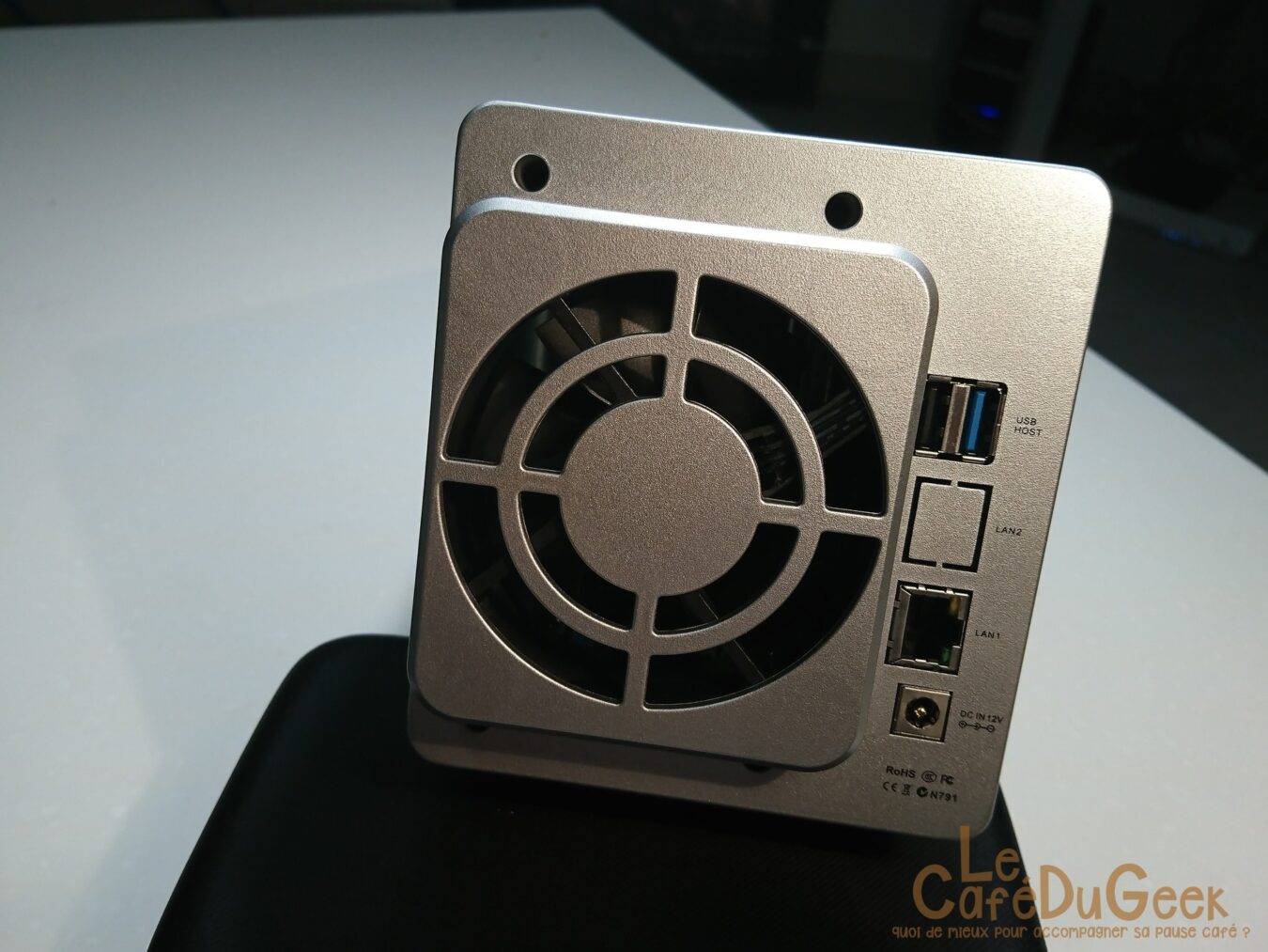 Niveau conception le NAS donne une bonne impression. Le tout à l’air solide, des racks HDD à la conception générale du produit. Un unique ventilateur est présent à l’arrière. Ce dernier délivre un niveau sonore correct et ne dérange pas, tant que le NSA n’est pas présent dans une chambre sans aucun bruit environnant. On retrouve à l’arrière également 1 port USB 2.0 et un autre en 3.0. Le F2-220 dispose d’un seul port RJ45 et pour finir il y a le connecteur de charge.