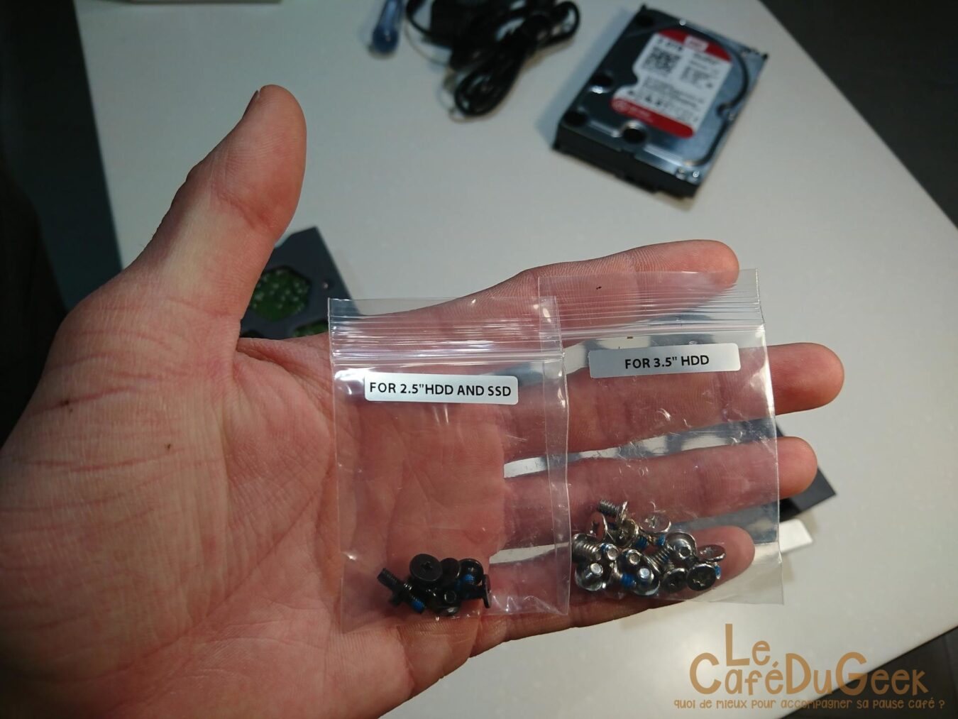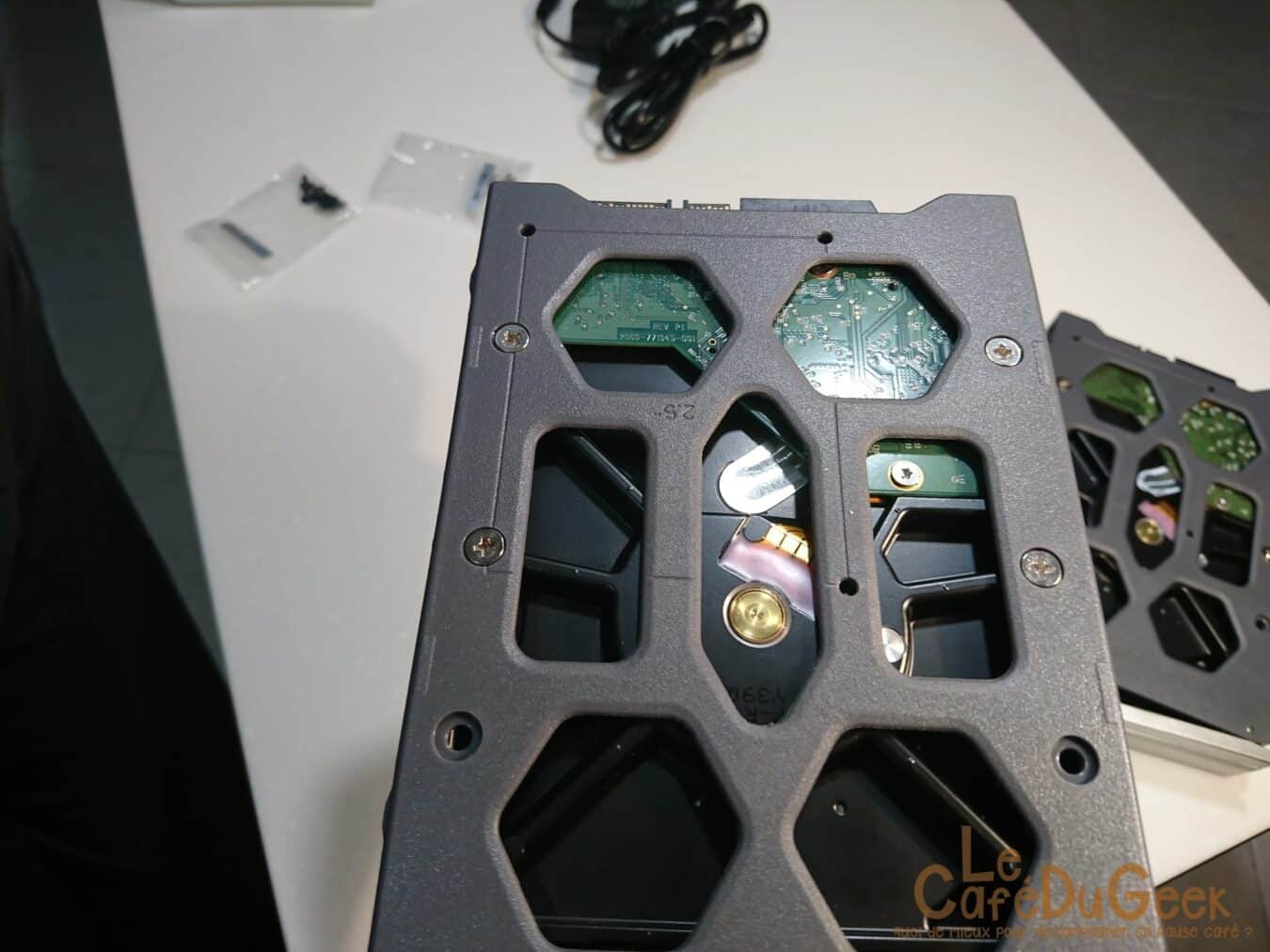 Les racks HDD sont bien pensés et il est facile d’ajouter ou d’enlever un disque dur. À noter qu’il est également possible de remplacer un disque dur à chaud. Pour placer les disques durs dans les racks, rien de plus simple. Il suffit d’utiliser les vis mises à disposition (4 suffisent) sur le dessous du rack, et c’est tout !