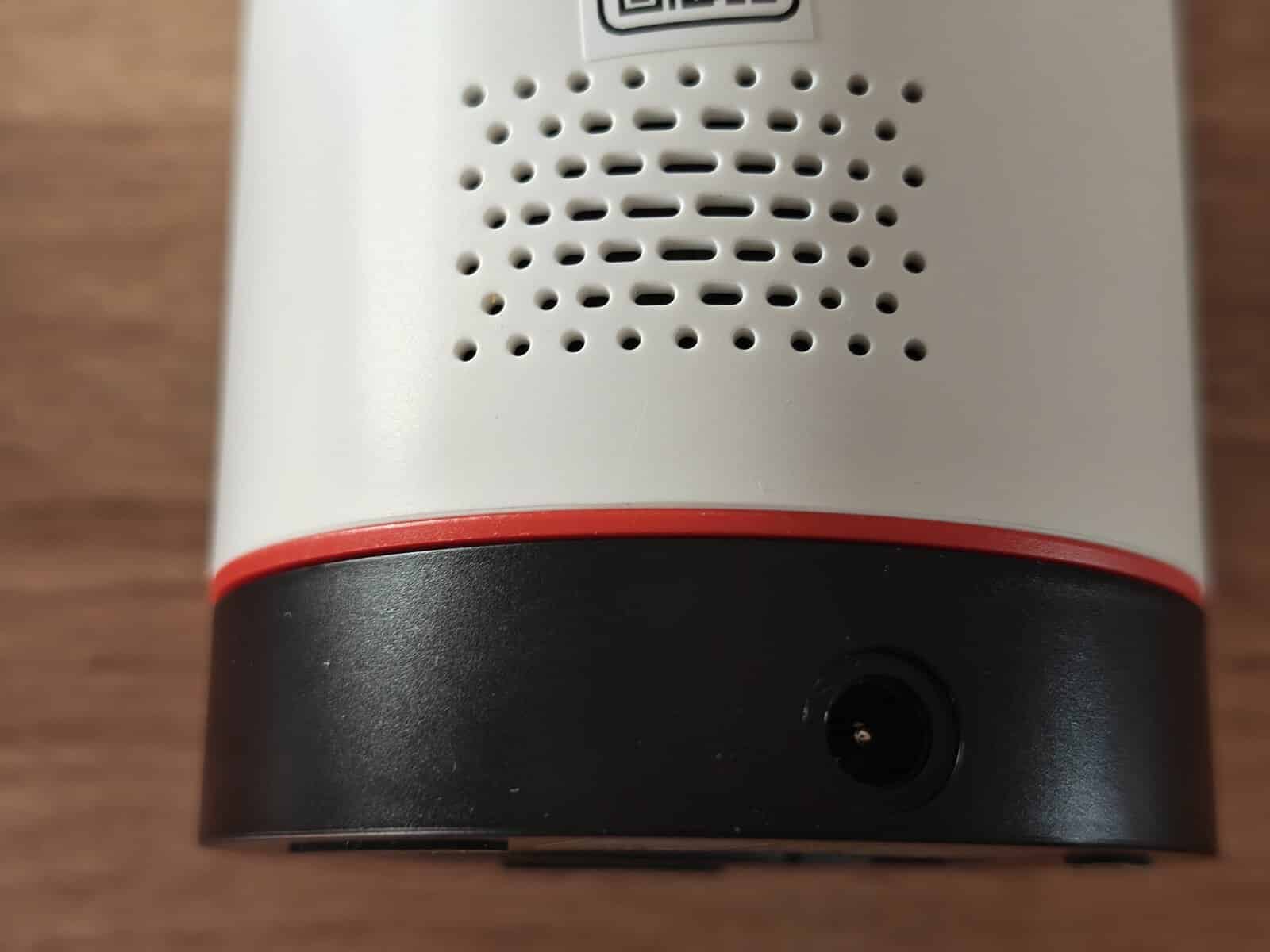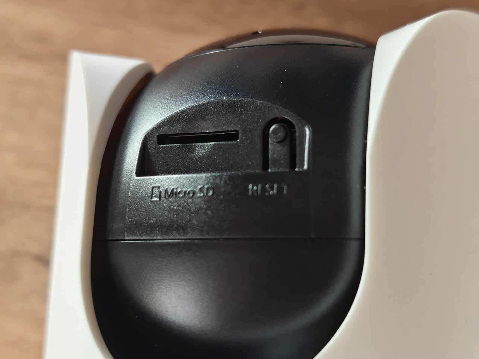 La caméra affiche un design cylindrique blanc de 8 cm de diamètre pour 11 cm de hauteur. Sa base noire soutient la partie motorisée, capable de pivoter sur 360°. Le poids (environ 320 g) reste raisonnable pour un appareil à poser ou fixer. Le logement pour carte microSD (512 Go max) se situe sous le capteur, tandis que le haut-parleur et la prise secteur se trouvent à l’arrière.