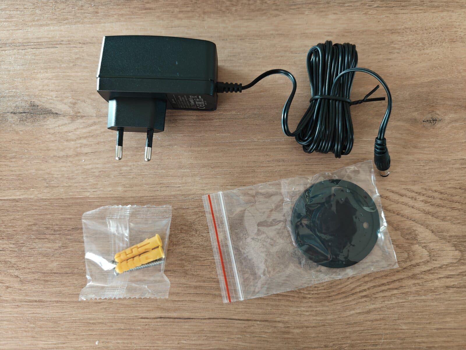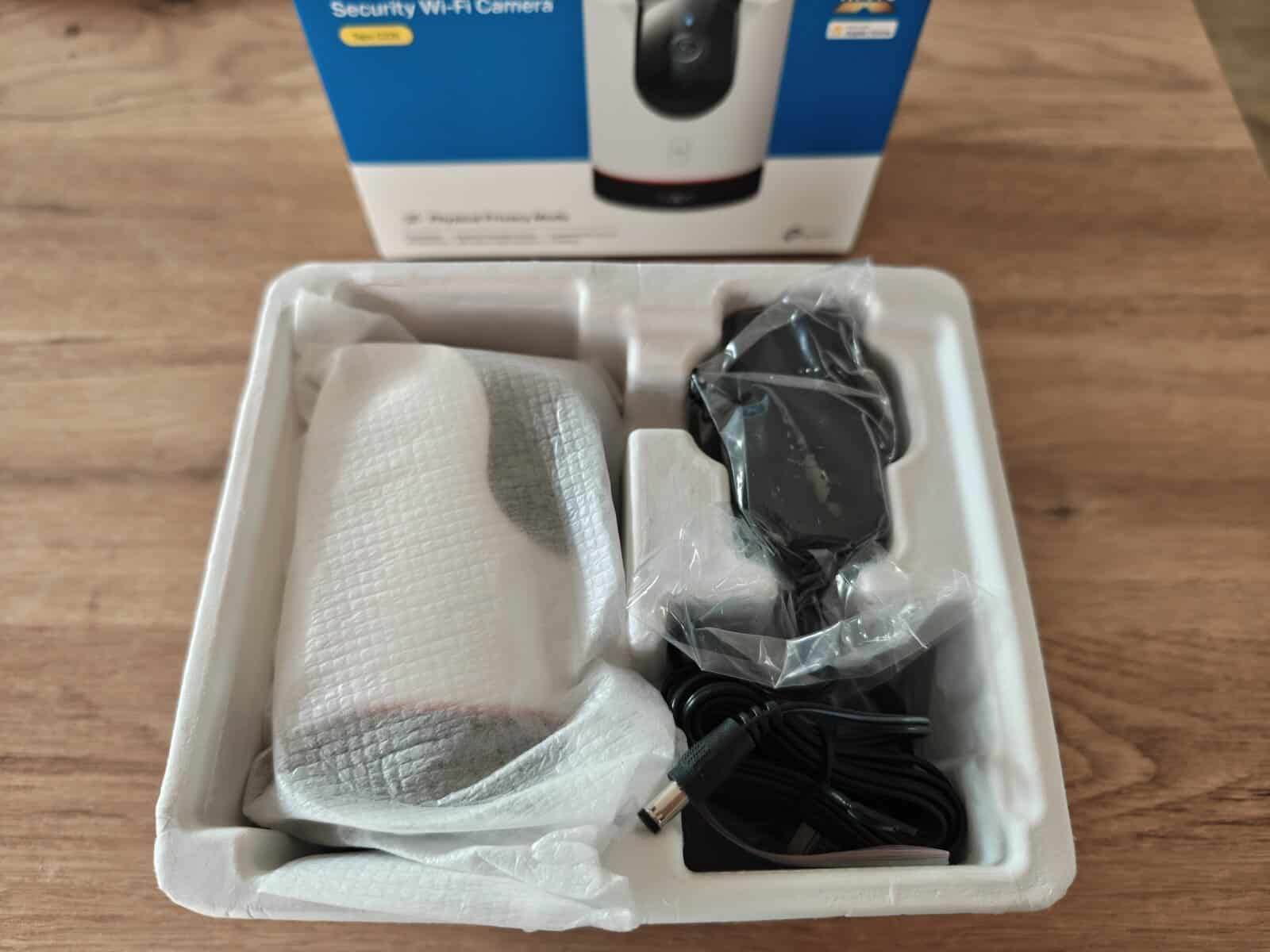 La boîte contient la caméra Tapo C225, un adaptateur secteur et son câble d’alimentation, un guide de démarrage rapide, des vis de fixation, un gabarit mural et une base de montage. L’ensemble est simple, clair et bien présenté.