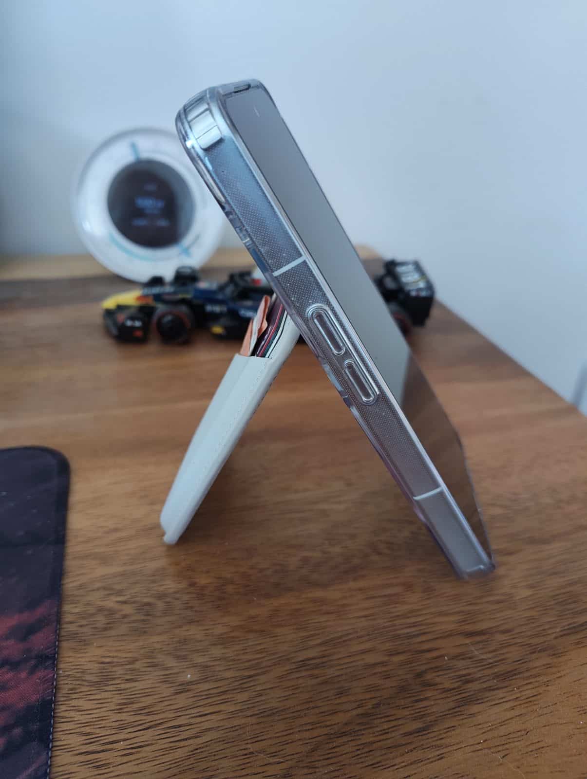 Ce qui change tout, c’est la stabilité. J’ai posé le smartphone sur un bureau en bois, sur une table en verre, et même sur une surface légèrement inclinée. Le téléphone tient. La charnière ne cède pas. Donc on n’a pas cette sensation de support “fragile” qui se referme tout seul. Autre point intéressant : les aimants restent efficaces même avec trois cartes à l’intérieur. Pourtant, certains wallets perdent en adhérence lorsqu’ils sont remplis. Ici, je n’ai constaté aucun décrochage.