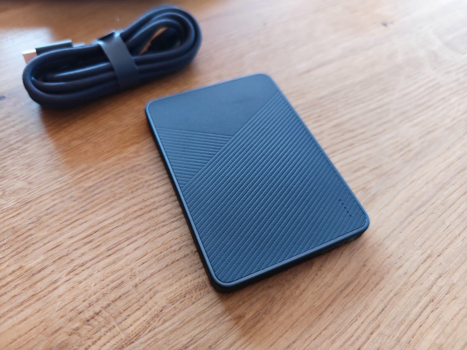 Deux coloris sont disponibles : Slate (anthracite) et Dune (sable). Le modèle Slate testé ici s’accorde visuellement avec la quasi-totalité des iPhones récents. La boîte contient également un câble USB-C tressé de 1,5 m, ce qui est une vraie attention. La plupart des concurrents à ce prix livrent soit rien, soit un câble bas de gamme. Ici, le câble est solide, long, et tressé. C’est un détail, mais un détail qui compte.