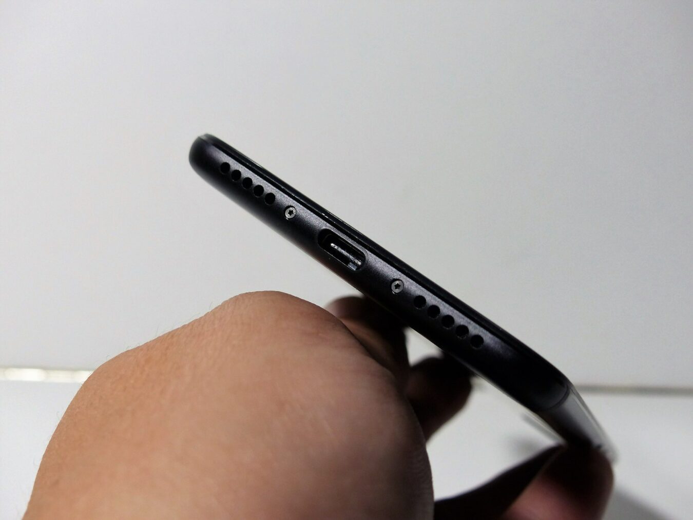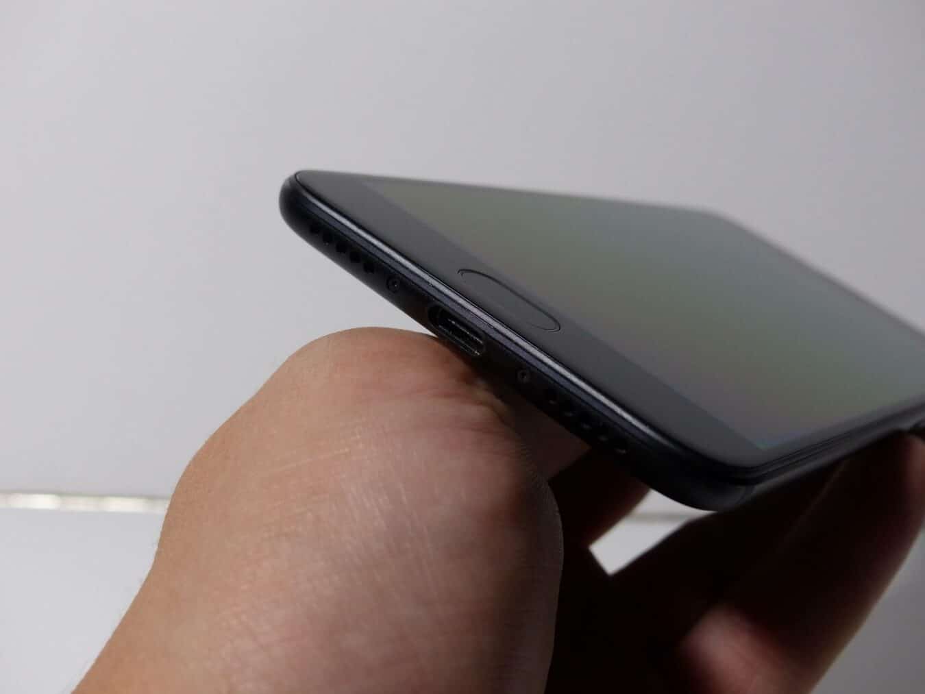En dessous on retrouve le haut-parleur qui délivre un excellent son sur les graves, médiums et aiguës. Et la prise type C est vraiment appréciable car aucunes prises de tête pour le sens de branchement, c’est réversible. En façade, il y a le bouton tactile qui fait office aussi de lecteur d’empreinte ultra rapide. Mais sur les côtés de ce bouton il y a aussi des boutons tactiles, non retro-éclairés, pour la navigation sous Android 7.0. On les trouve facilement et ils répondent très bien.