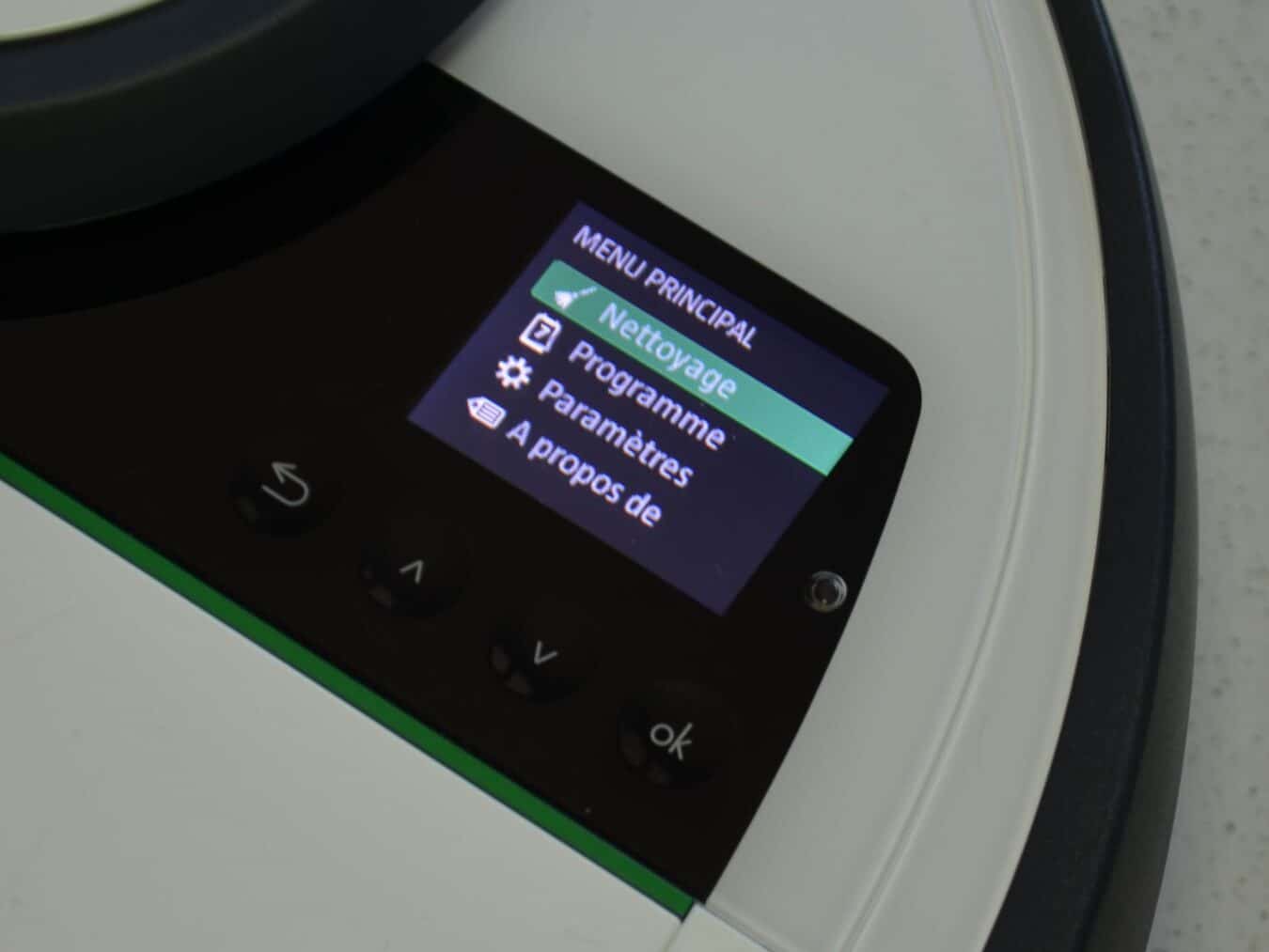 On retrouve sur le dessus de ce Kobold VR200, un écran en couleur pour accéder aux réglages et lancer les phases d’aspiration. Dans le menu, il est possible de changer l’heure, de créer des programmations d’aspiration, de choisir le mode d’aspiration, l’émission acoustique de l’aspiration et de le mettre à jour. Des boutons tactiles sont disposés sous cet écran et sont réactifs. Pour ce qui est de la partie « menu », nous en avons tiré un avantage, sa facilité d’exécution. Programmer le robot est une chose aisée, tout le monde peut s’y mettre et nul n’a besoin de lire la notice.