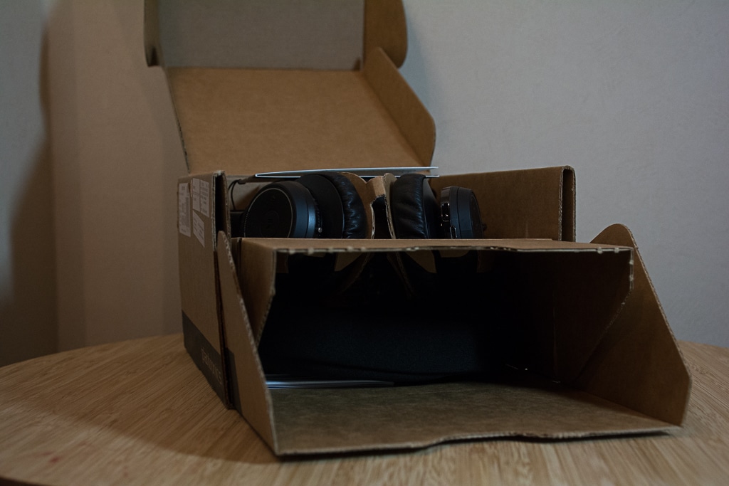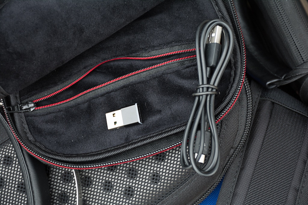 Le casque vous arrive dans une boîte en carton dans laquelle on retrouvera, sur le dessus, le casque, le dongle Bluetooth ainsi que le socle de recharge. Dans la partie inférieure de la boîte, nous est livrée une pochette de transport molletonnée, un câble micro-USB pour le rechargement sans le socle et de la documentation.
