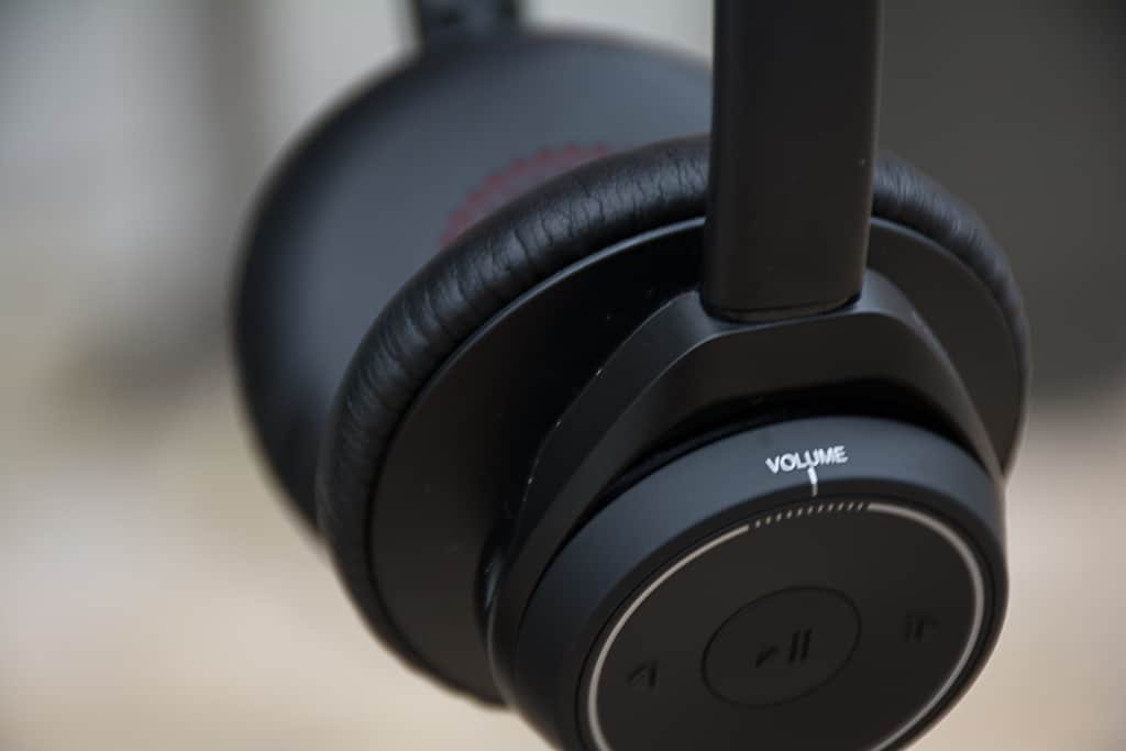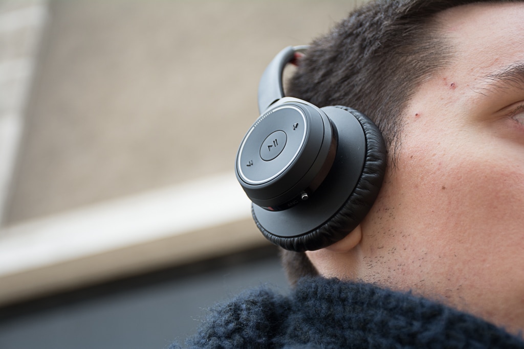 L’une des deux oreillettes intègre sur la surface de l’oreillette trois boutons dédiés aux changements des pistes musicales et à la mise en pause de la musique mais également une molette de réglage du volume et sur le dessous un bouton coulissant pour activer ou désactiver l’annulation active du bruit.