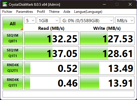 Sur le terrain, les performances du WD Black P10 6 To confirment son orientation gaming. Les mesures réalisées affichent une vitesse moyenne de 133 à 140 Mo/s, stable sur de longues sessions, ce qui reste excellent pour un disque mécanique.