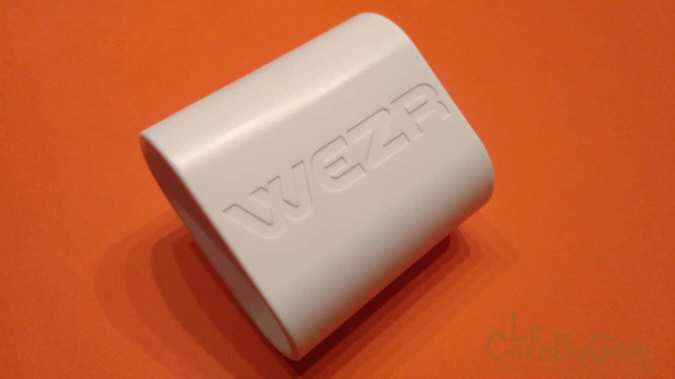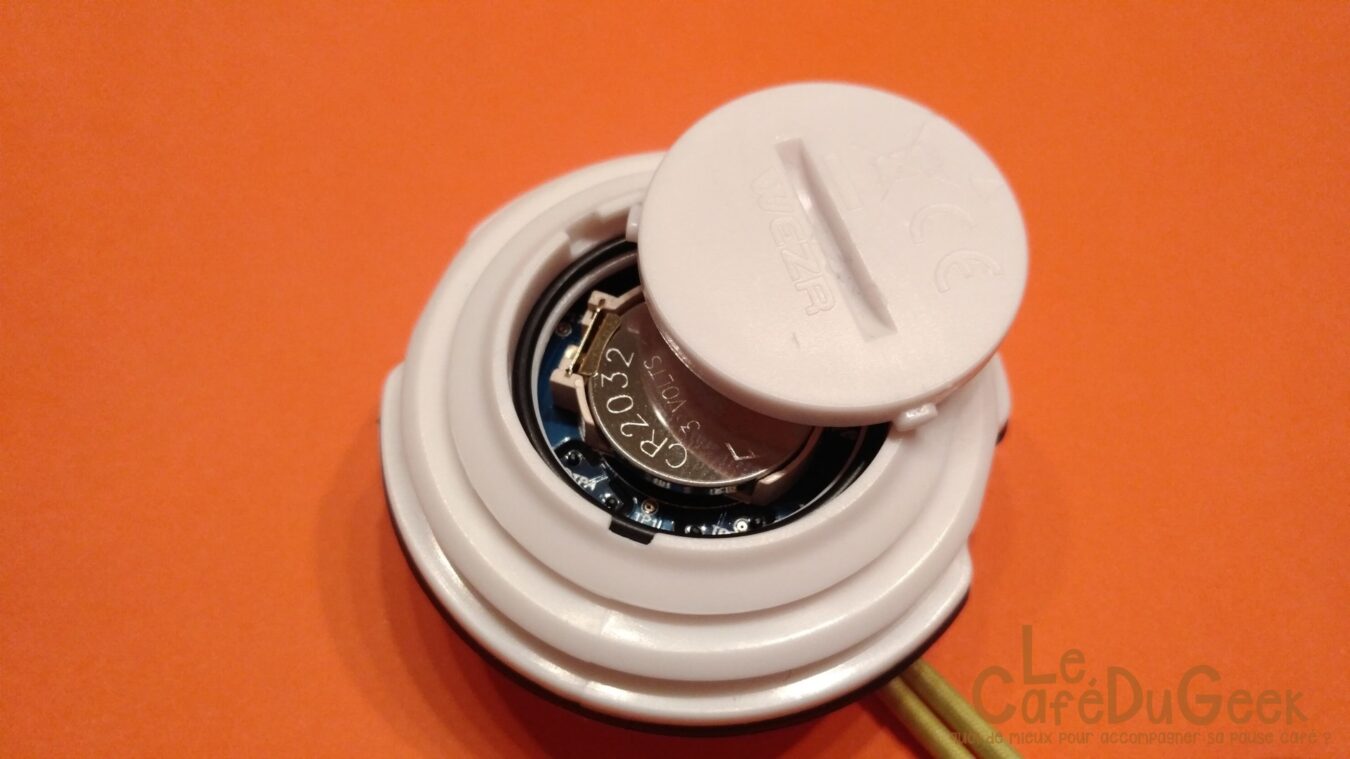 Le capteur possède un unique bouton, qui sera utile une seule fois au début pour appairer le capteur à l’application ! Il est situé sur la tranche, de manière très discrète. On retrouve également un élastique, très utile et bien pensé qui permettra de fixer le capteur un peu partout. Pour finir, sous le Wezr est présente une petite trappe, qui contient la pile, une CR2032.