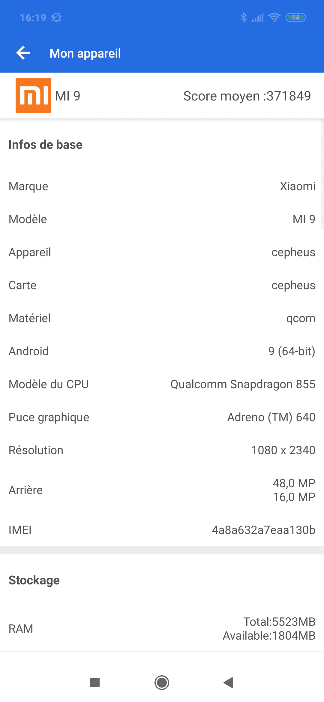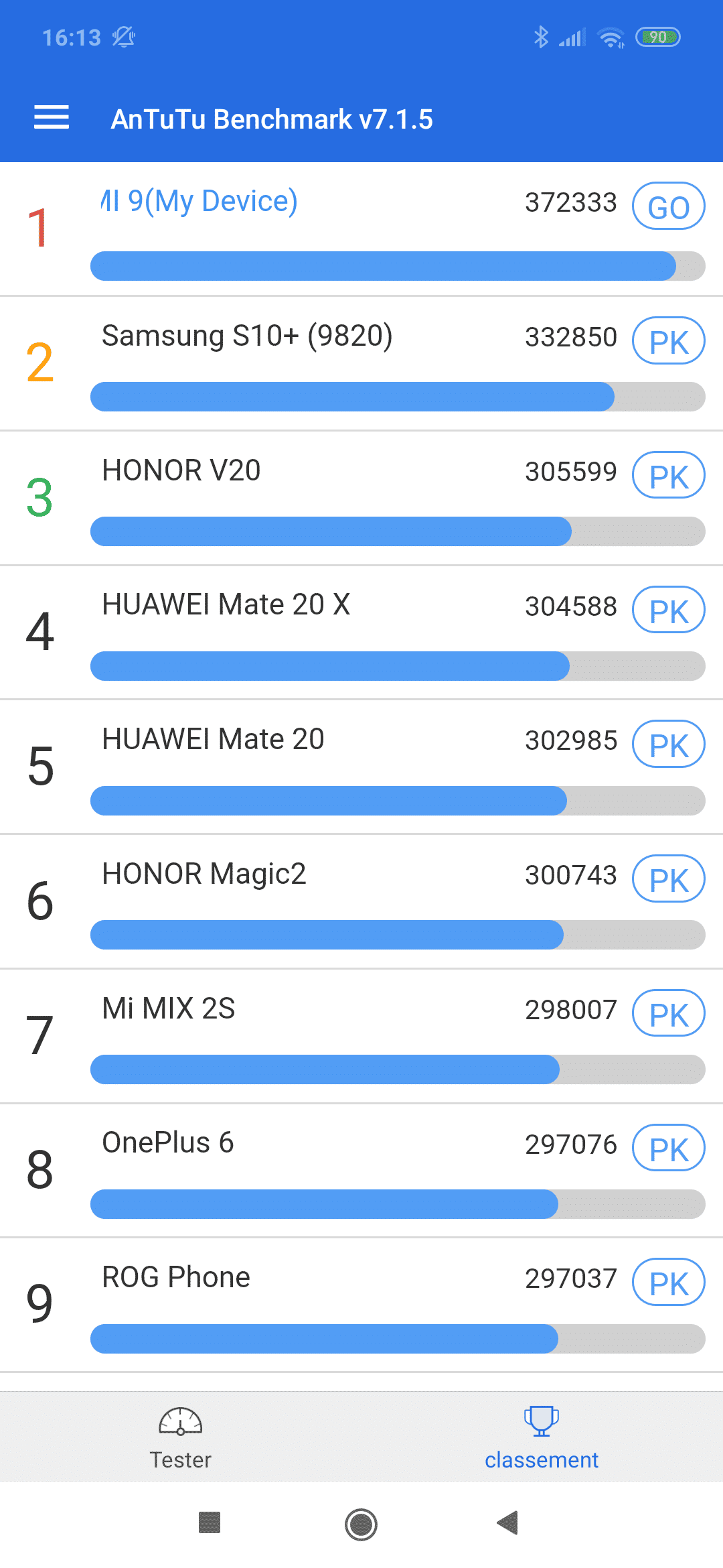 Le Mi 9 est doté du nouveau soc Qualcomm Snapdragon 855. Ce dernier est épaulé par GPU Adreno 640. Le tout tournant avec 6 Go de Ram. Clairement le smartphone en a sous le capot. Nos tests réalisés sur AnTuTu ont affiché des performances de haute volée. Le Mi 9 ressort en top sur la liste comparative. En plus l’appareil ne chauffe que très peu c’est bluffant.