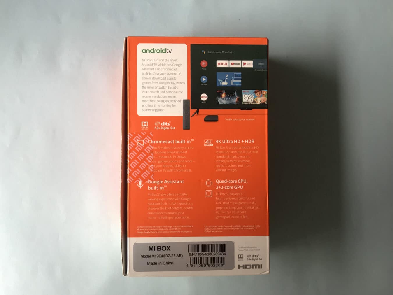 La boîte Orange de la Xiaomi Mi Box S est plutôt agréable à regarder. Comme tous les emballages de la marque, les caractéristiques techniques se situent toujours à l’arrière de la boîte. Elle indique au consommateur final la compatibilité avec la 4K HDR, Dolby Atmos, Google Assistant, mais aussi de l’intégration native d’un Google Chromecast.