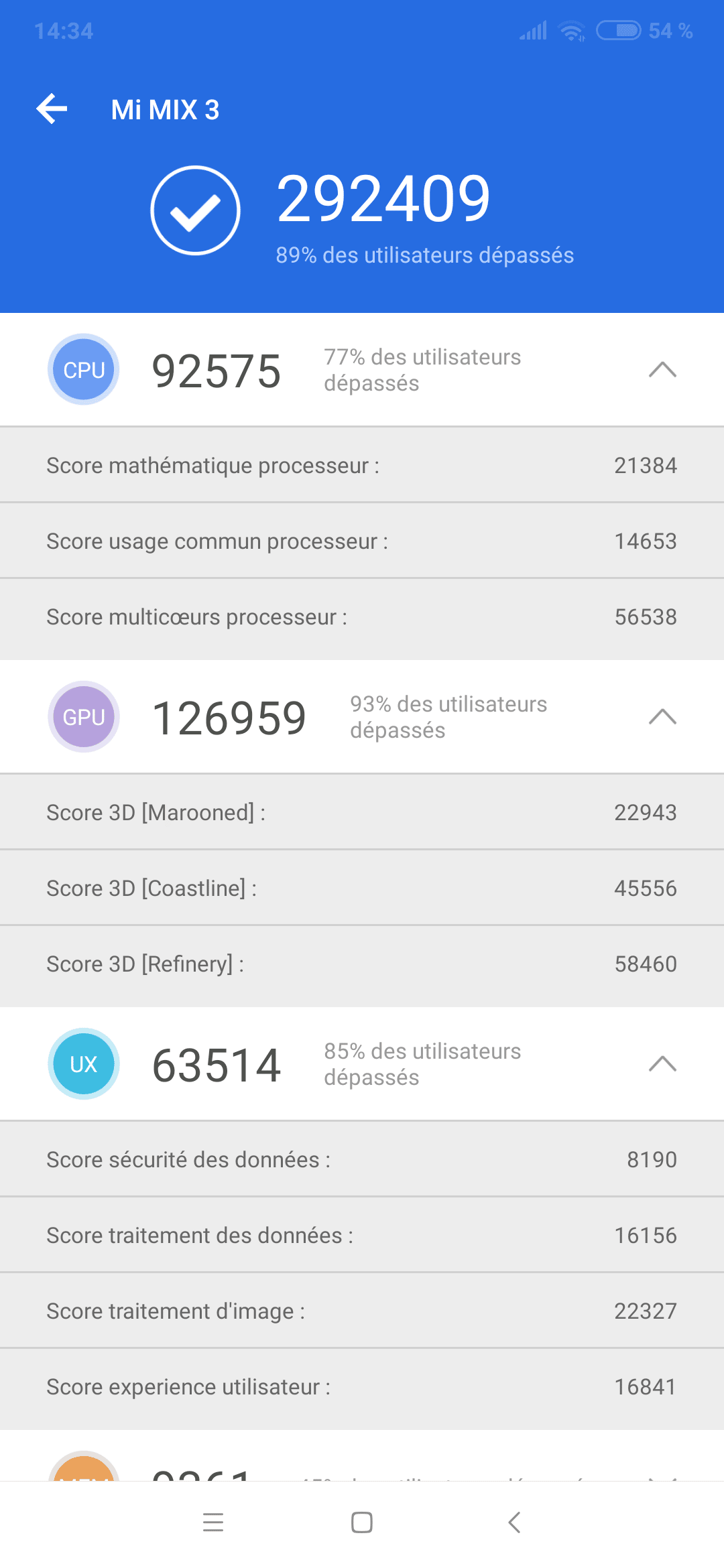 Au niveau des benchmarks, on retrouve un score de 292409 sur Antutu. L’association CPU/GPU est très bonne et permet au smartphone de se placer dans les hauts rangs.