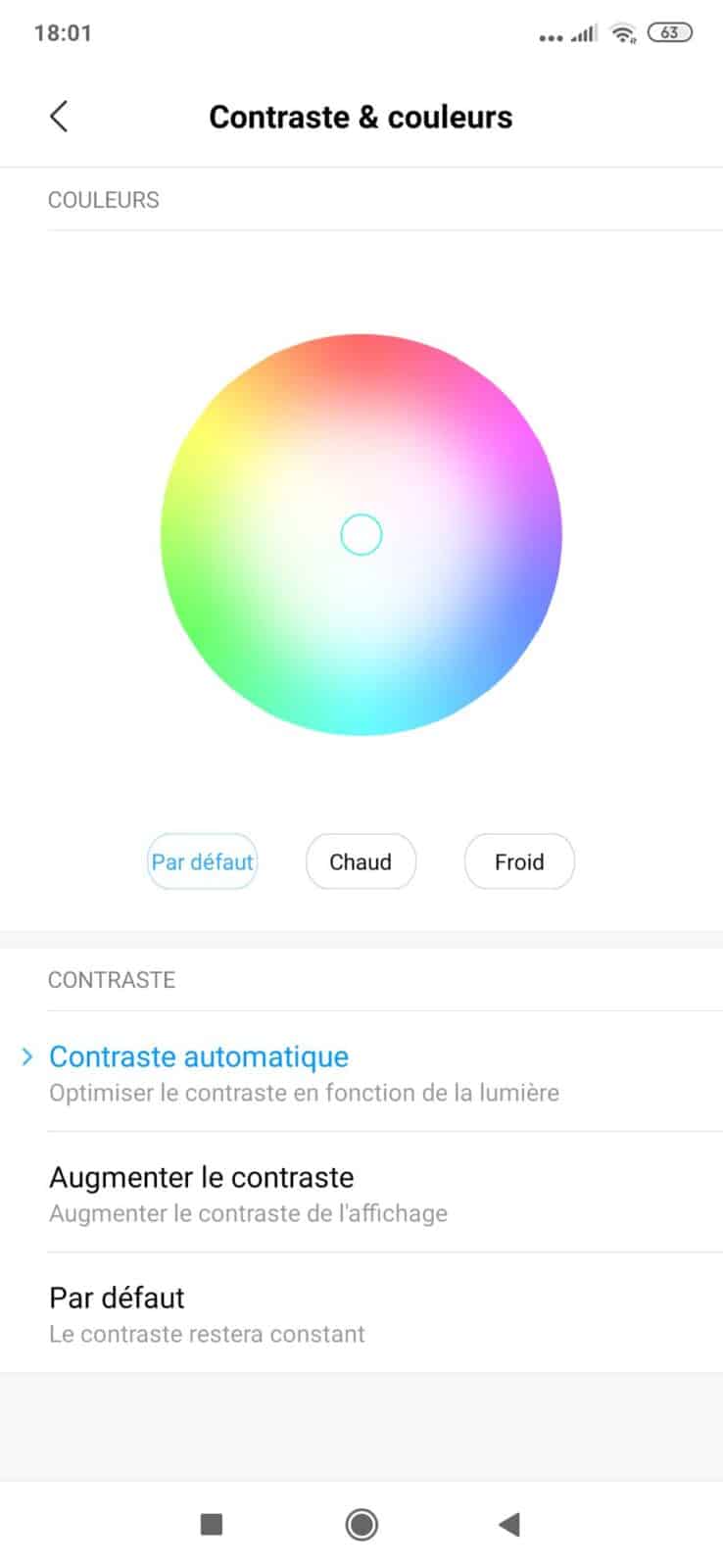 Si le réglage des couleurs par défaut du smartphone ne convient pas, il est possible de changer celle-ci via les réglages d’affichage fournis dans l’interface logiciel de Xiaomi. Il est donc possible de modifier la température des couleurs entre chaudes et froides. On peut également modifier le contraste qui est réglable soit de manière automatique, soit manuellement.