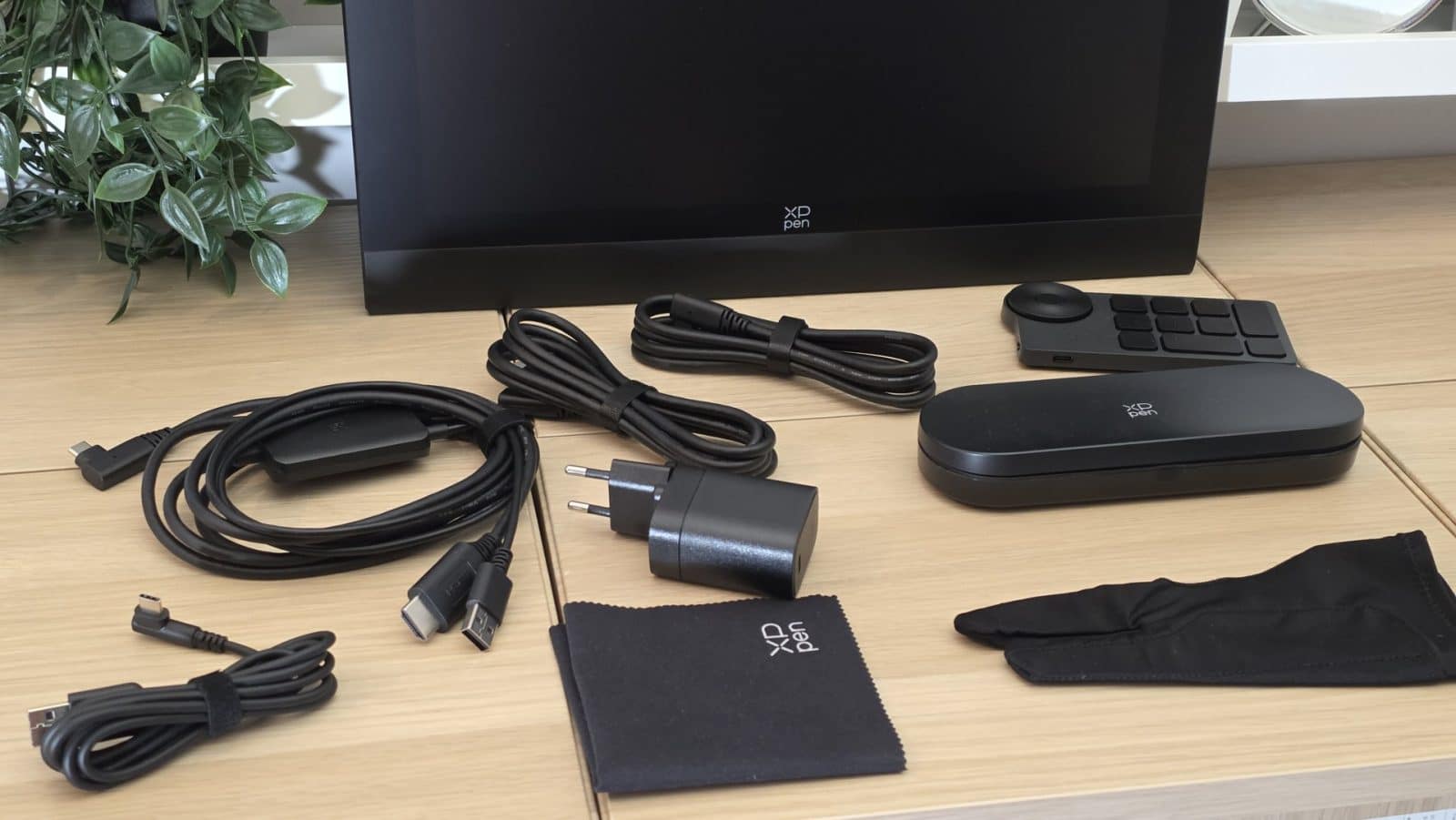 L’emballage de la XPPen Artist Ultra 16 annonce immédiatement la couleur : on est sur du haut de gamme. Le contenu est impressionnant. Deux stylets, un boîtier avec embouts, une télécommande Bluetooth, un gant, un chiffon, un support et plusieurs câbles. Tout est rangé avec soin, prêt à l’emploi. On sent que la marque veut offrir une expérience complète dès la première utilisation.