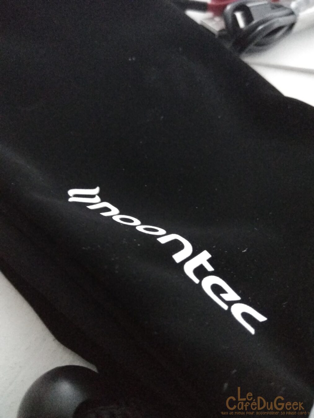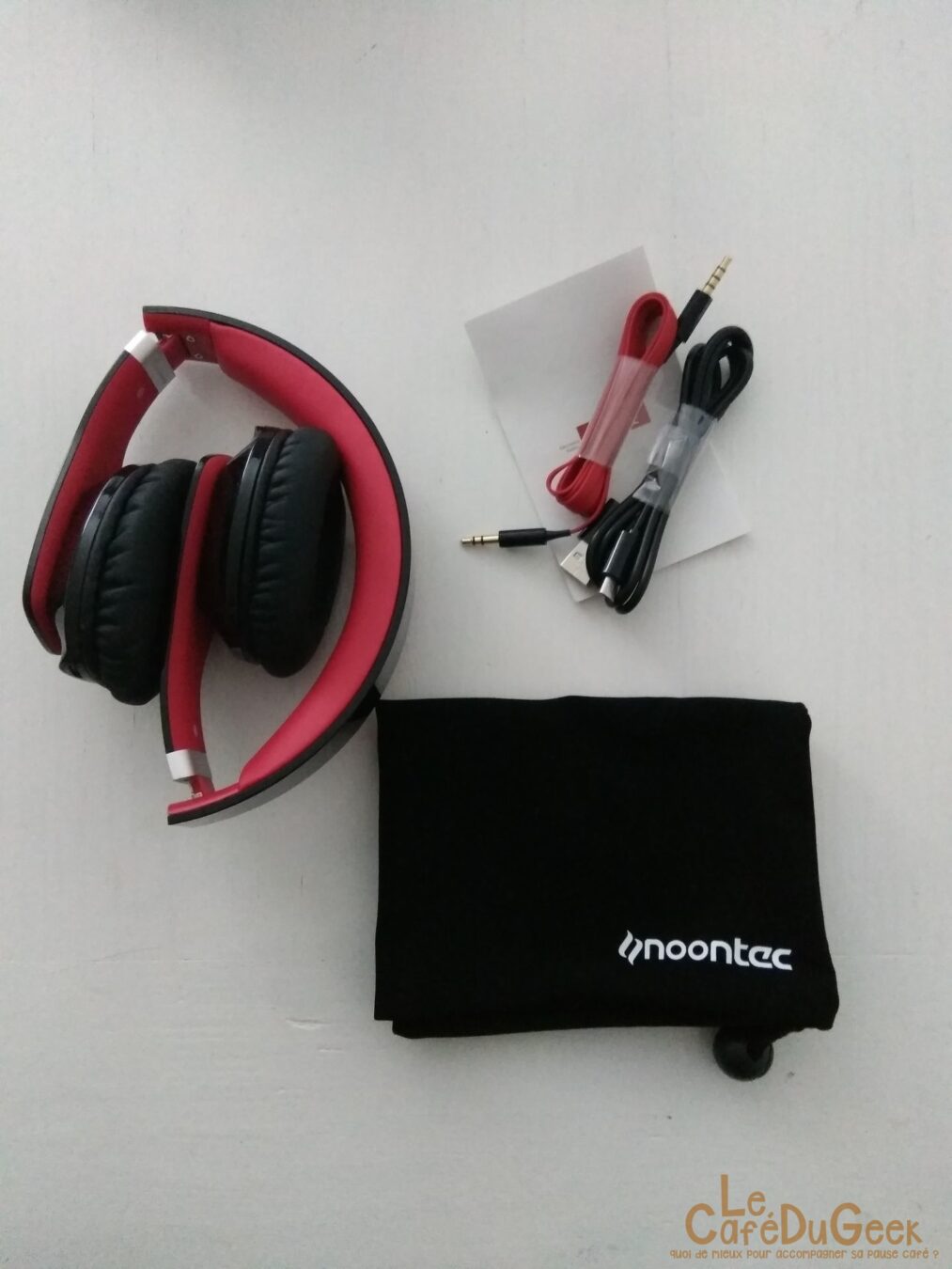 Vous recevrez le casque avec ses trois petits accessoires : une pochette de transport, un câble JACK->JACK (pour pouvoir le brancher à votre téléphone, MP3…) ainsi qu’un câble USB->MICRO USB vous permettant de le recharger sur une prise (non fournie). Sur le câble JACK vous retrouverez un bouton afin de mettre pause à votre vidéo/musique etc. Un microphone est également intégré !